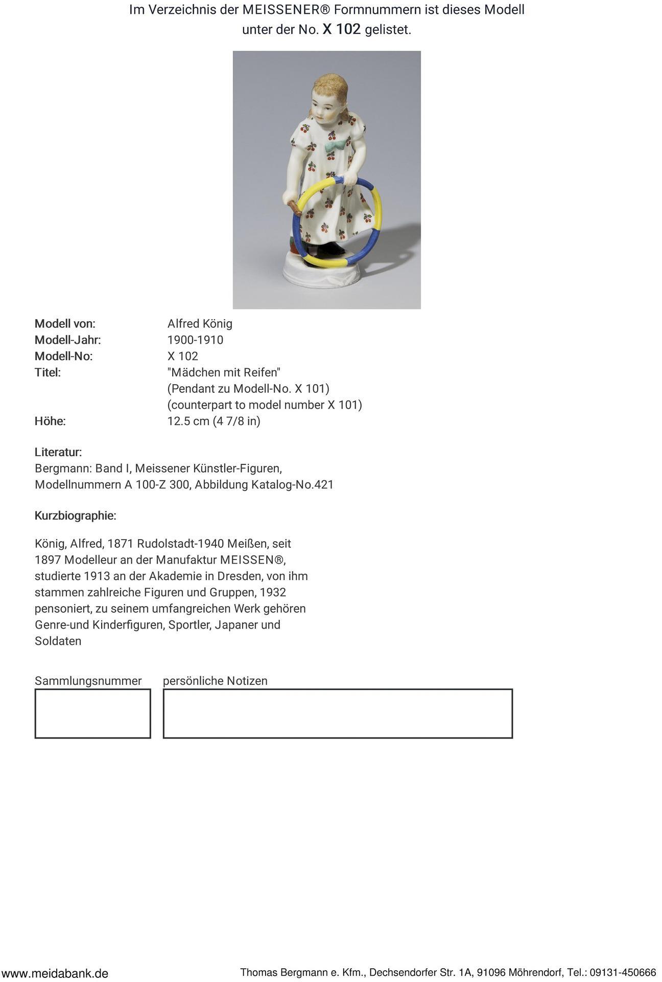 Pendant zu Modell-Nr. X 101 "Knabe mit Reifen", farbig bemalt. Ritzmarke, Pressmarke, Malermarke, Schwertermarke.