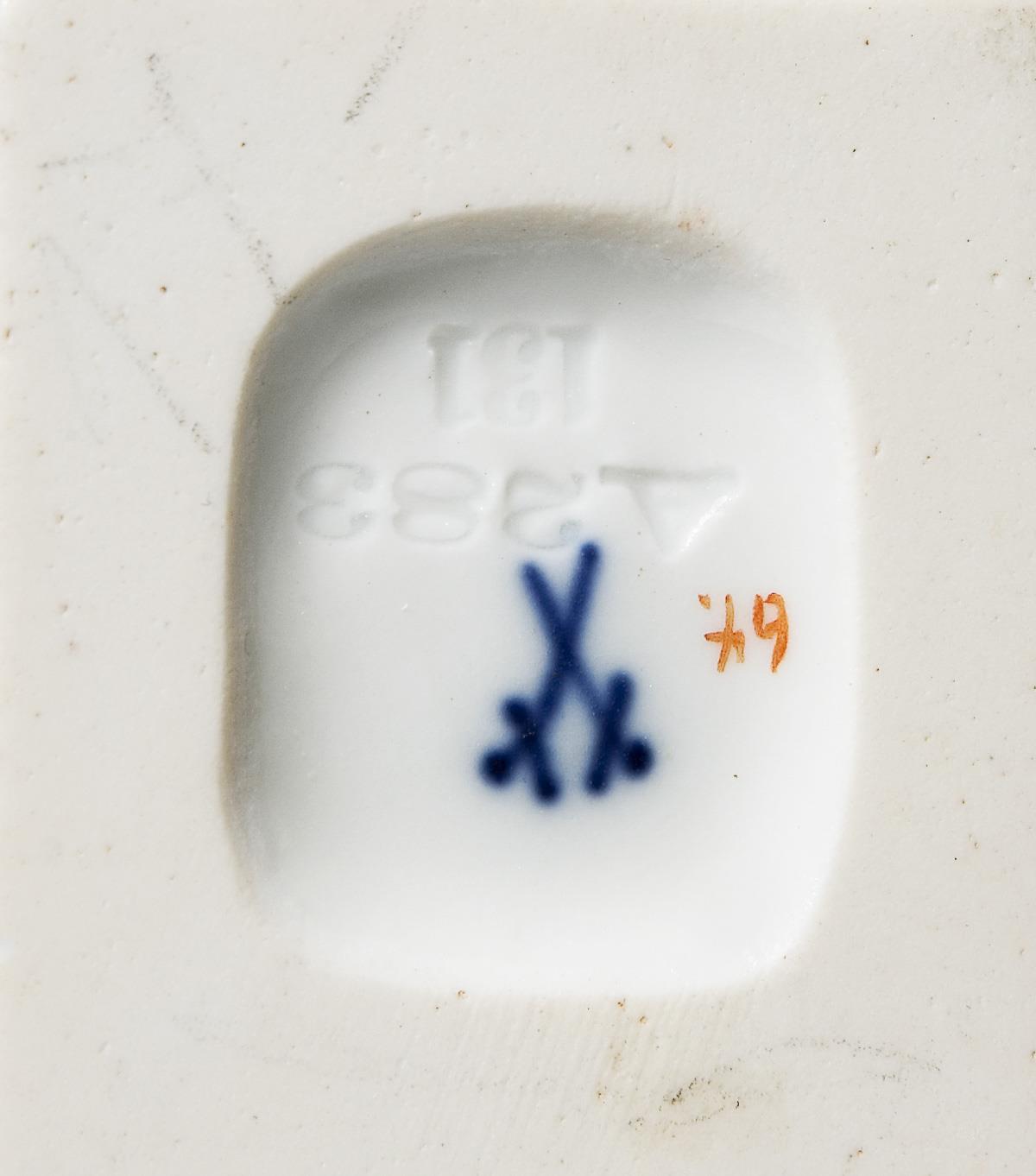 Farbig bemalt. Pressmarken, Malermarke, Schwertermarke, Künstler-Signet. Rückseitig kleine Glasurdefekte.