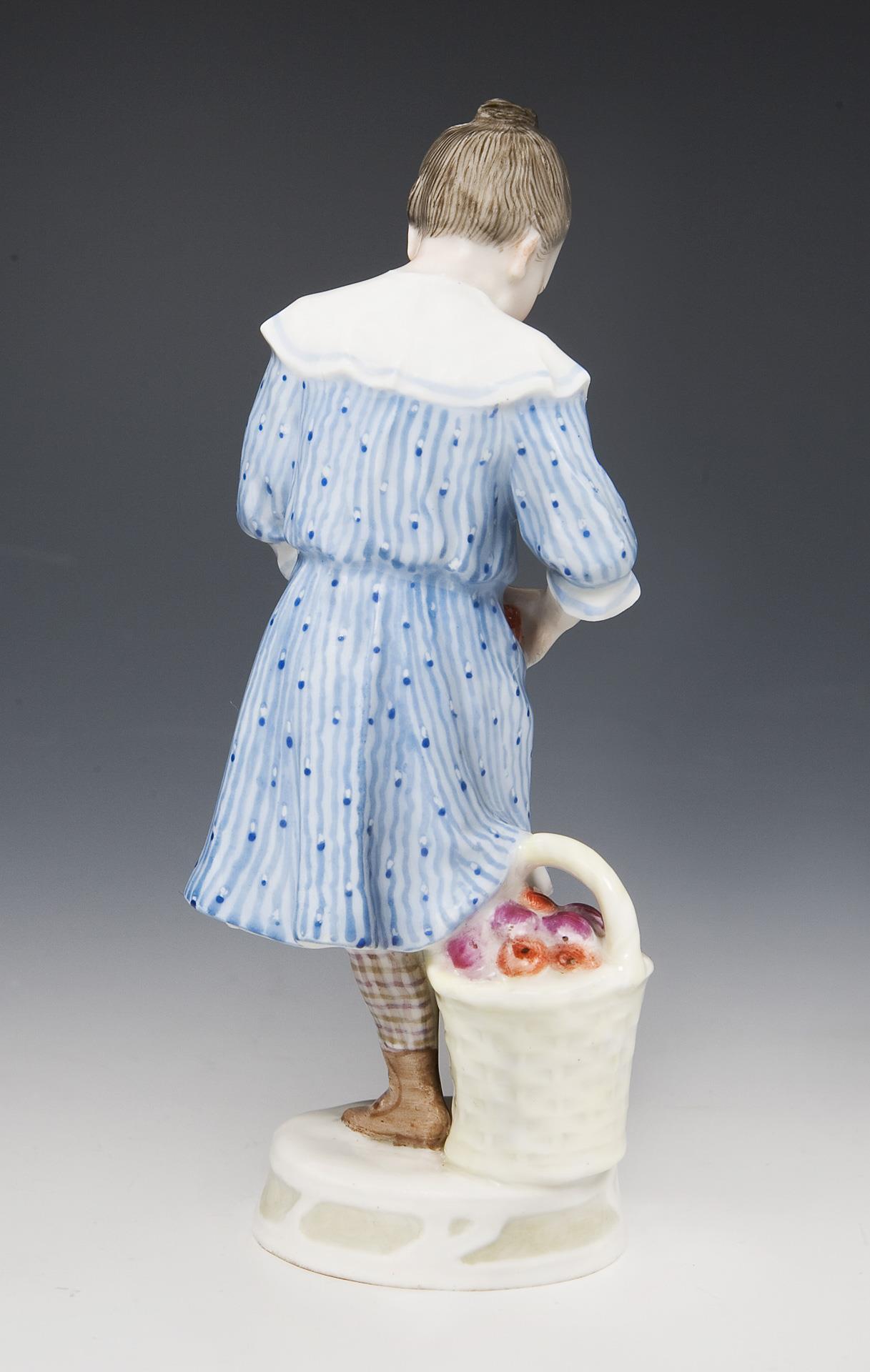 Pendant zu Modell-Nr. X 187 "Knabe mit Apfelkorb", farbig bemalt. Ritzmarke, Pressmarke, Malermarke, Schwertermarke.