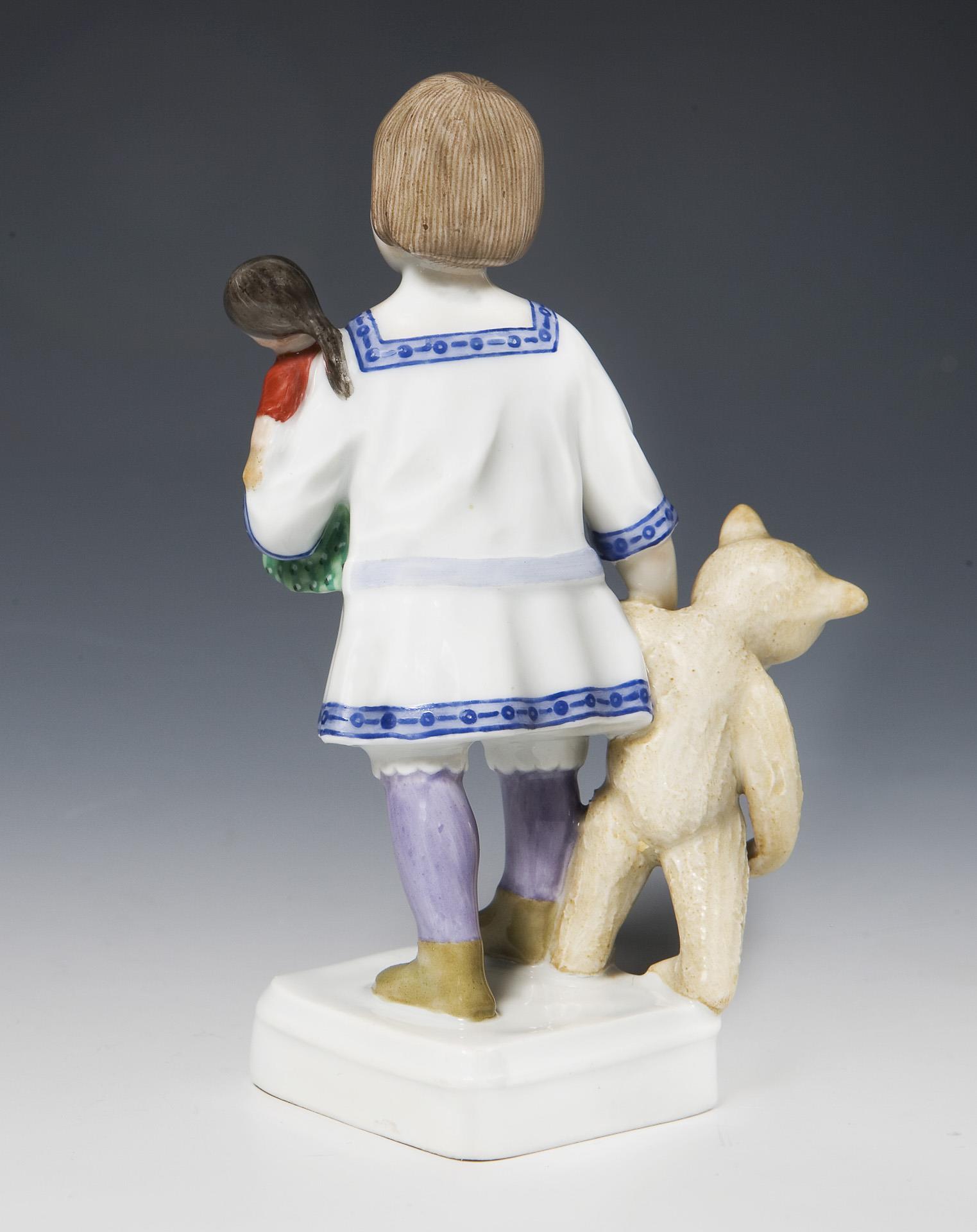 Jugendstil-Kinderfigur: Mädchen mit Puppe und Teddybär. Meissen.