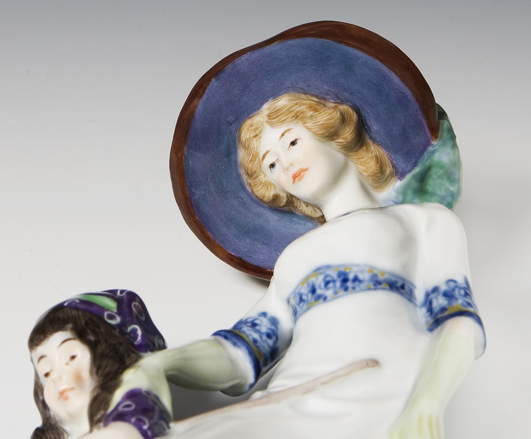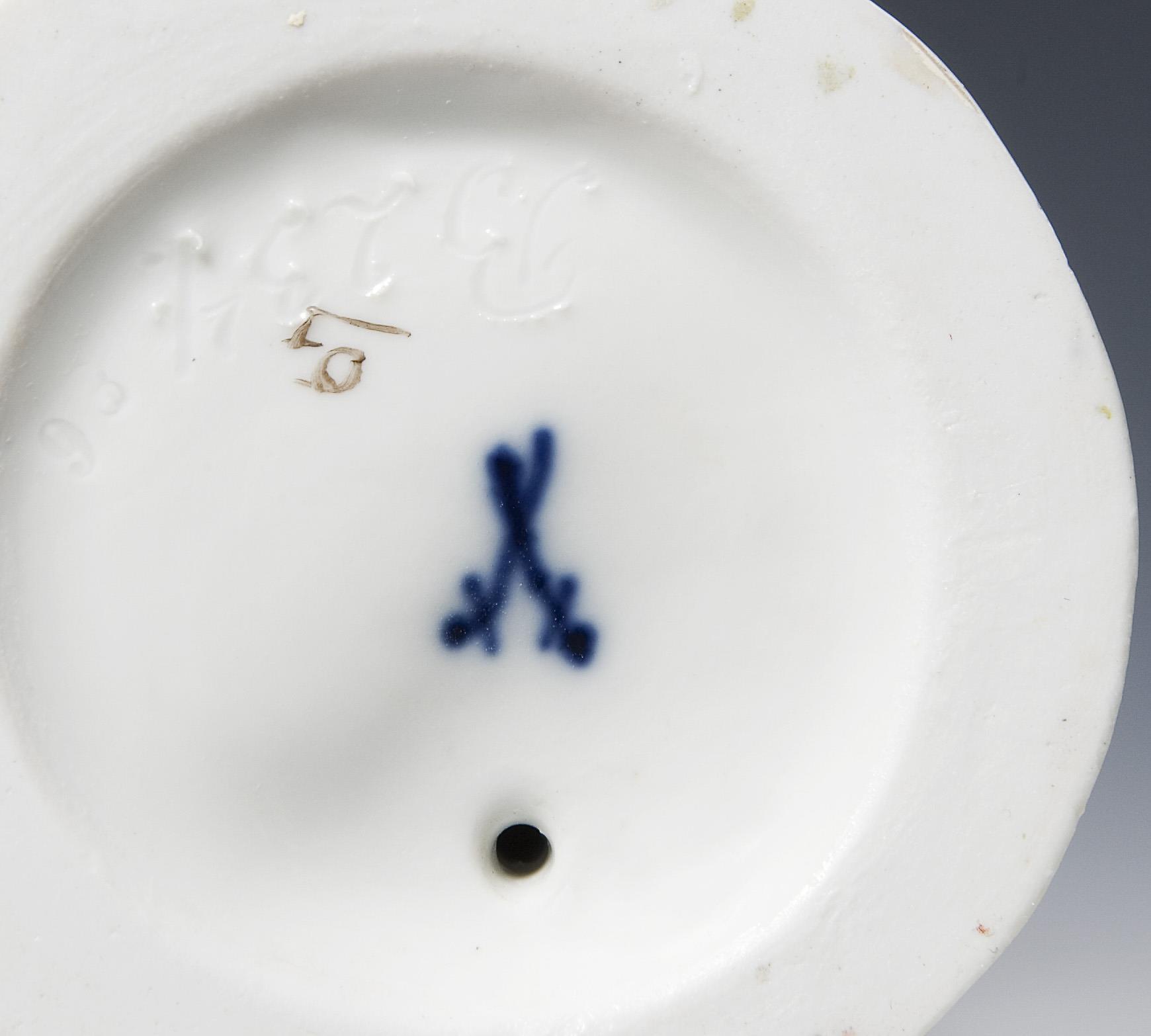 Farbig bemalt, Ritzmarke, Pressmarke, Malermarke, Schwertermarke, Künstler-Signet. Hut, eine Schuhschleife, Kescher fachmännisch restauriert.