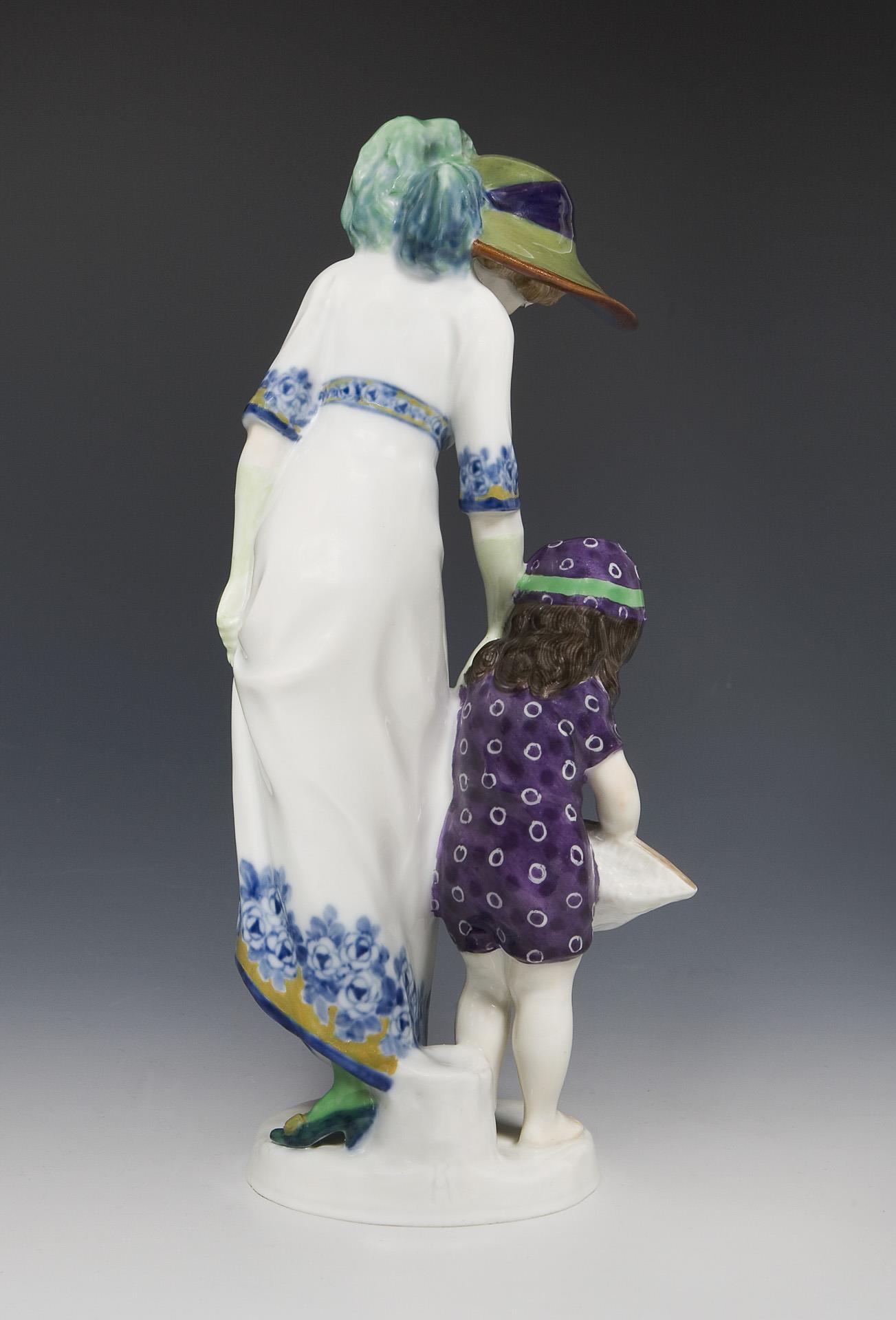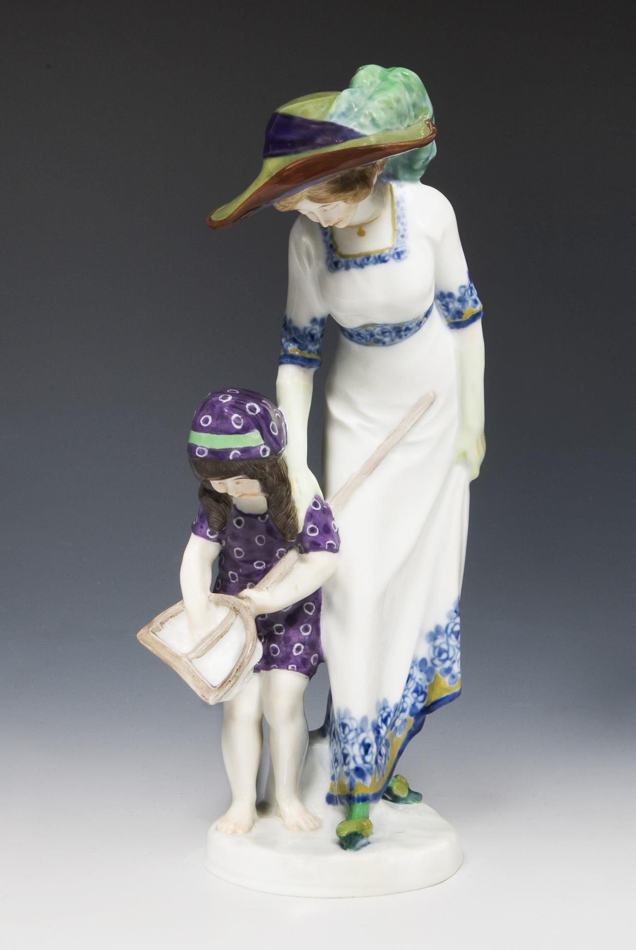 Jugendstil-Figurengruppe: Dame mit Kind am Strand. Meissen.