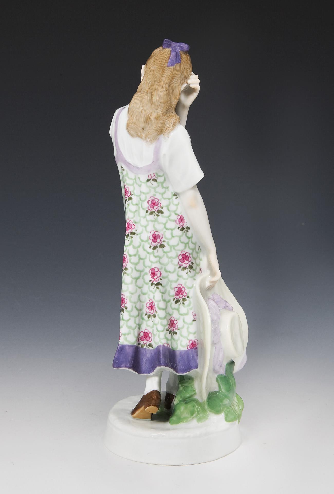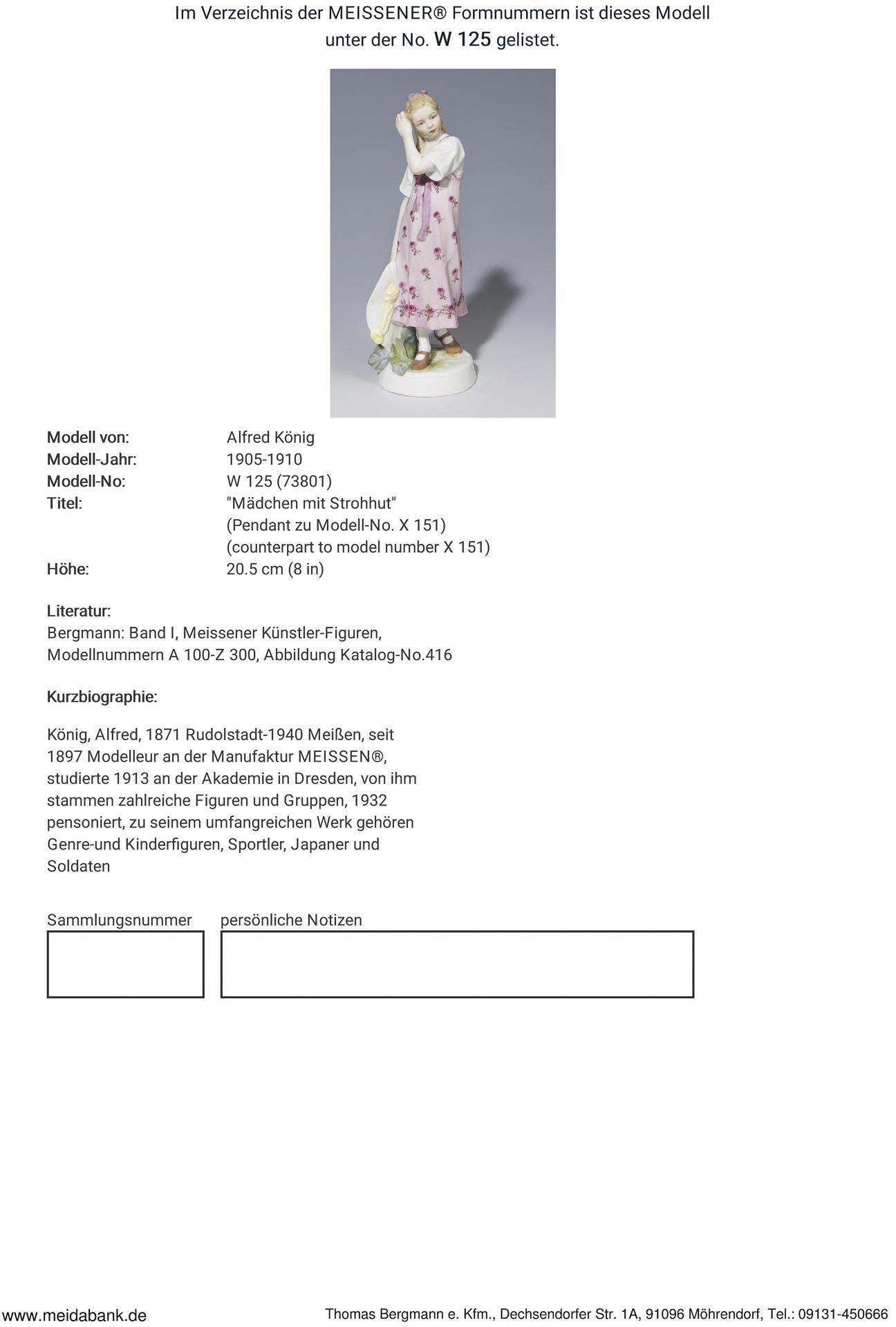 Pendant zu Modell-Nr. X 151 "Mädchen, einen Zopf flechtend", farbig bemalt. Ritzmarke, Pressmarke, Schwertermarke. Hut minimal bestoßen, kleiner Brandriss am Hut.