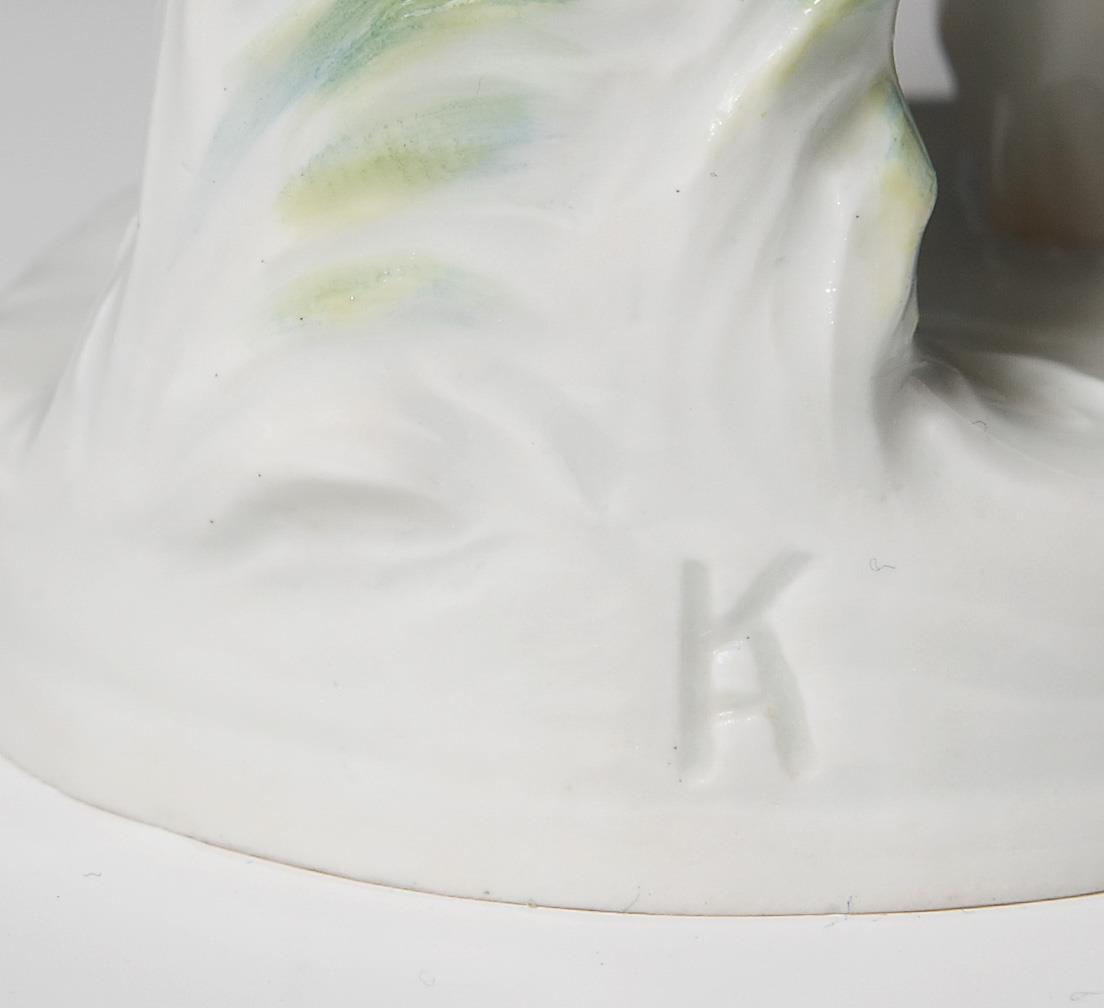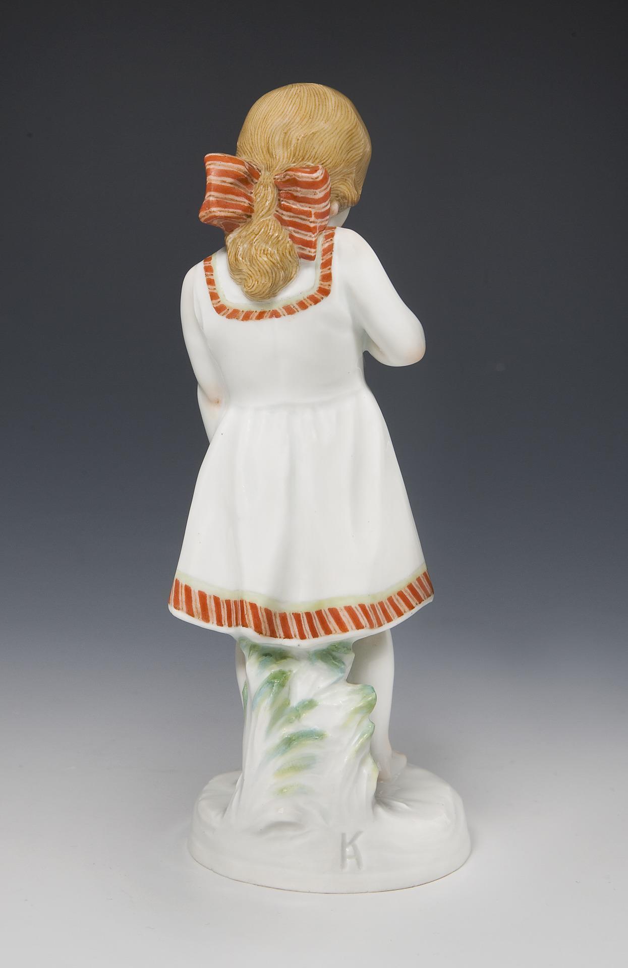 Pendant zu Modell-Nr. E 231 "Knabe mit Kescher am Strand", farbig bemalt. Ritzmarke, Pressmarke, Malermarke, Schwertermarke, Künstler-Signet. Kleiner Brandriss am Hals.