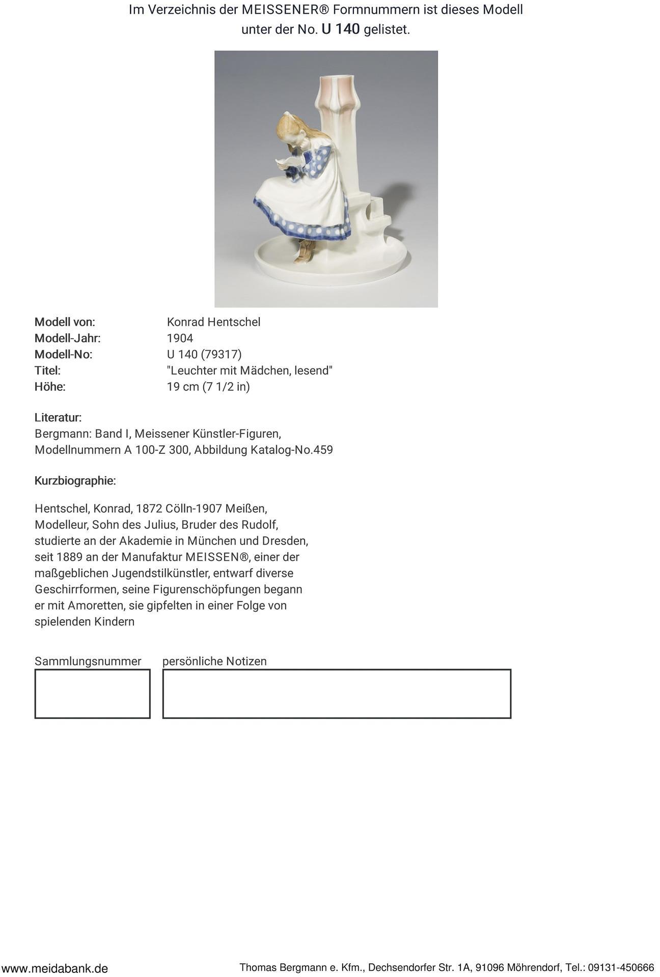 Ausformung 1904-1923. Modell-Jahr: 1904, Modell-Nr. U 140 (neue Form-Nr. 79317). Modell von. HENTSCHEL, Konrad(1872 Cölln - 1907 Meißen)