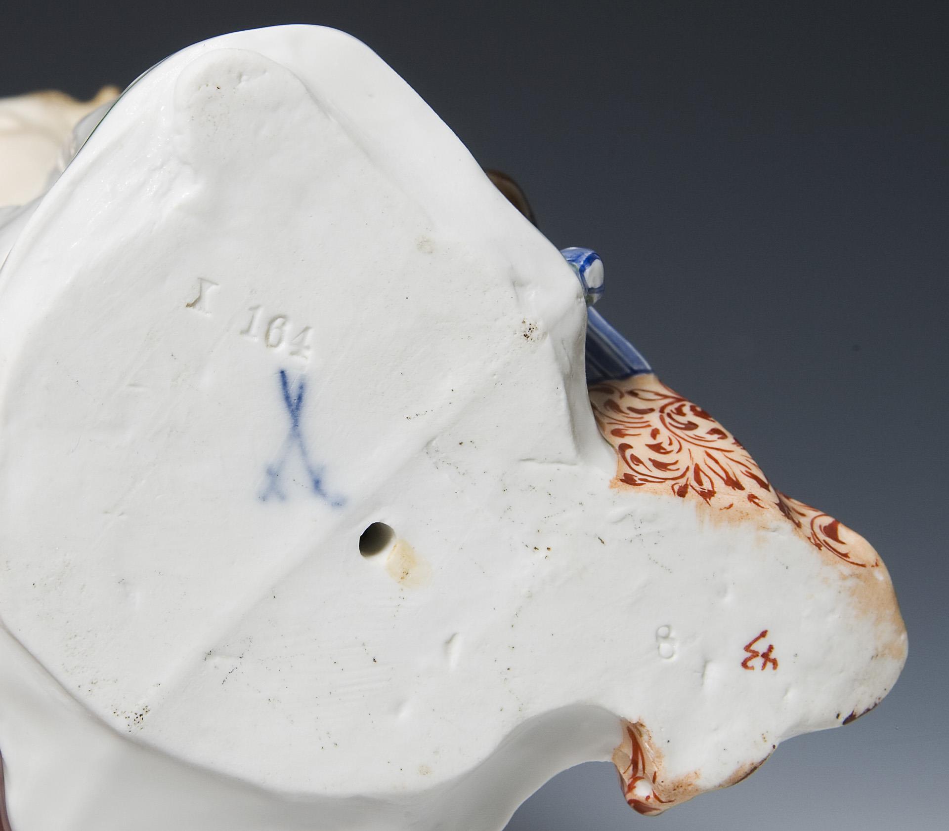 Farbig bemalt. Unglasierter Boden, Pressmarken, Malermarke, Schwertermarke.