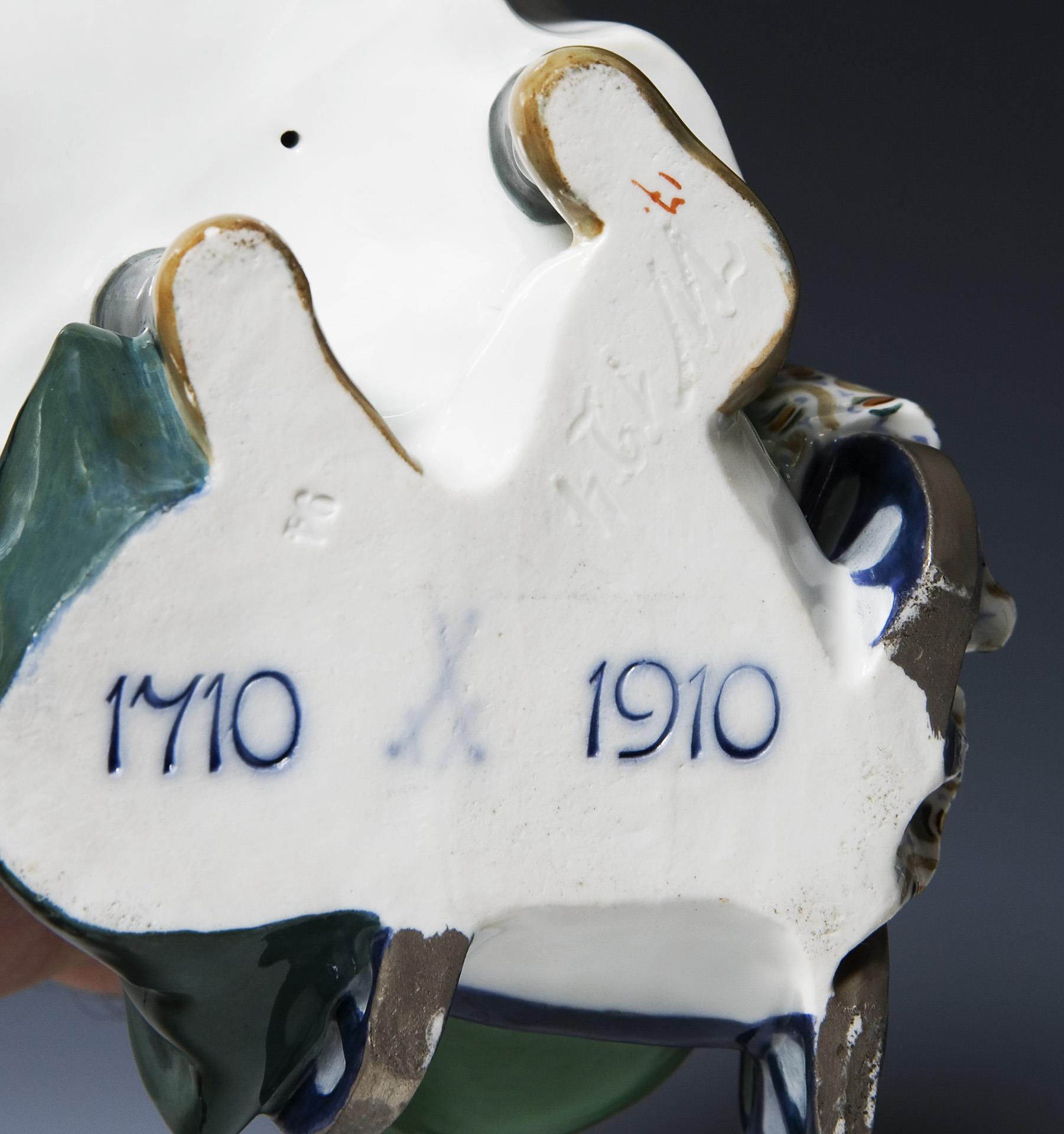 Farbig bemalt. Unglasierter Boden, Ritzmarke, Pressmarke, Malermarke, Schwertermarke, blaue Jubiläumsmarke 1710-1910. Kleiner Brandriss von unten im Kleid.