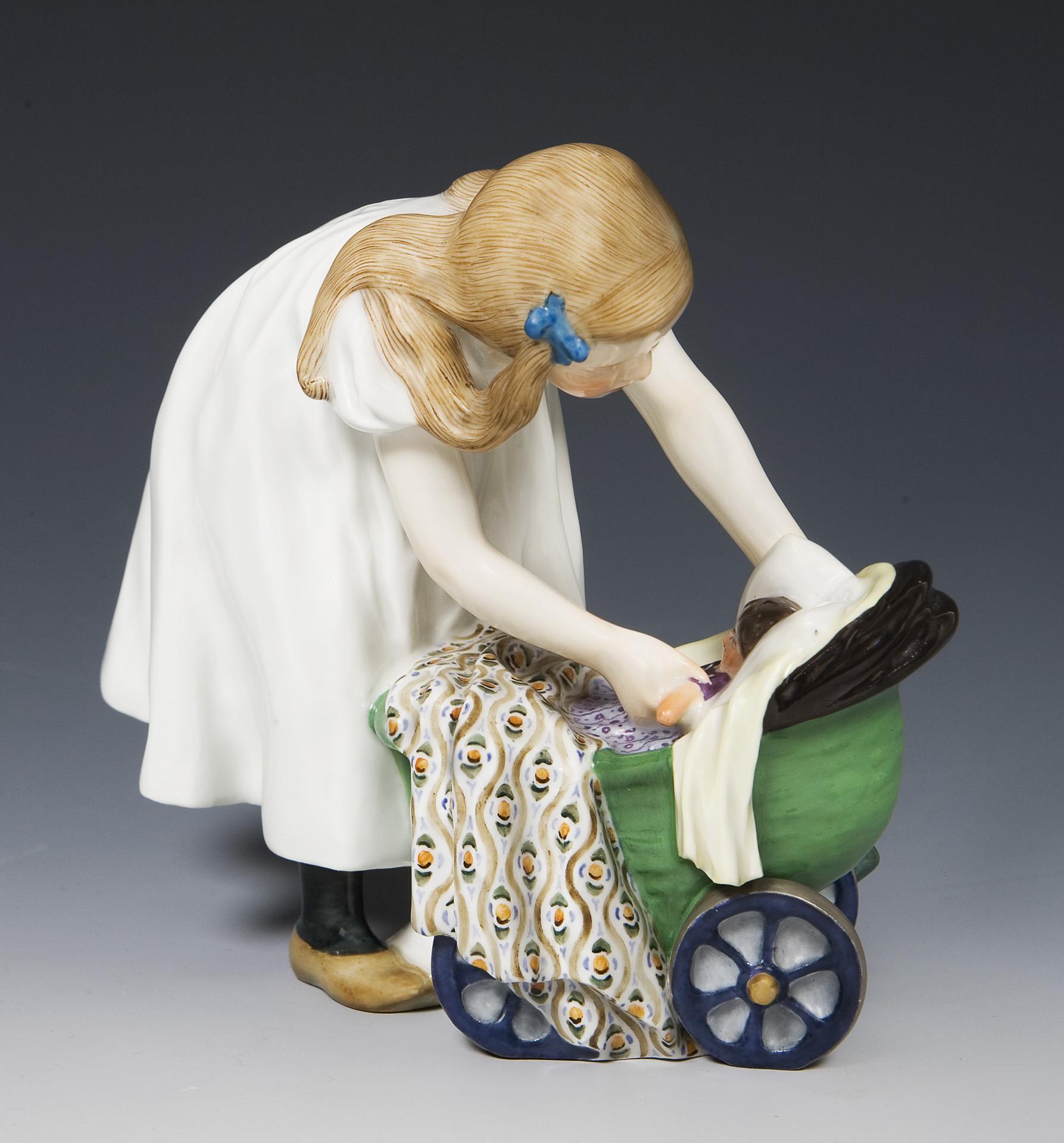 Jugendstil-Figur: Mädchen mit Puppenwagen. Meissen.