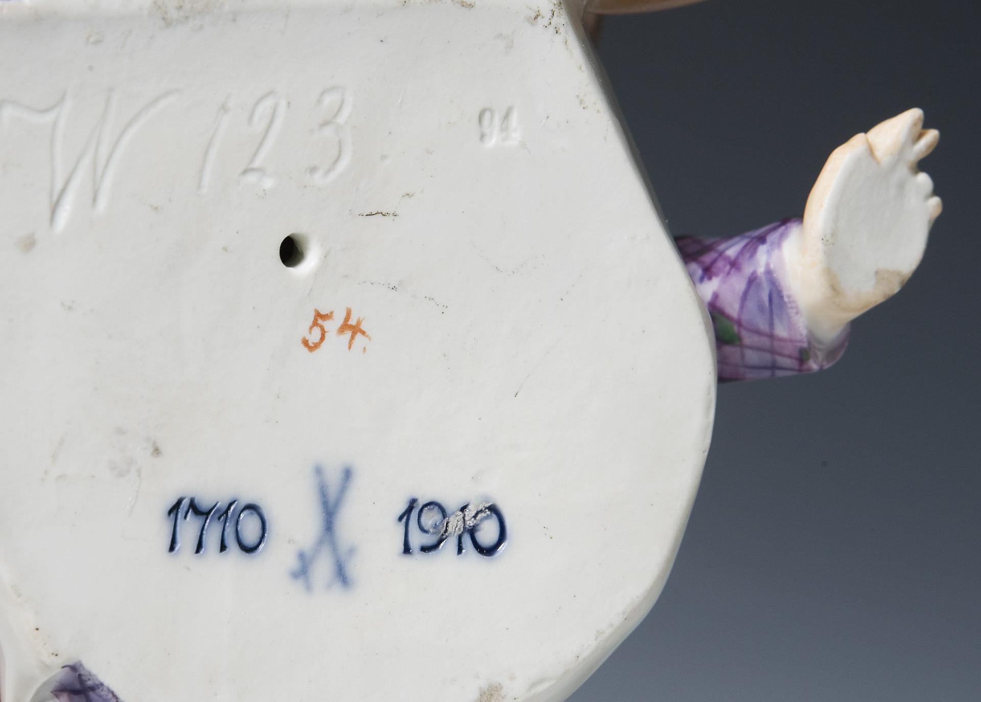 Farbig bemalt. Unglasierter Boden, Ritzmarke, Pressmarke, Malermarke, Schwertermarke, blaue Jubiläumsmarke 1710-1910.