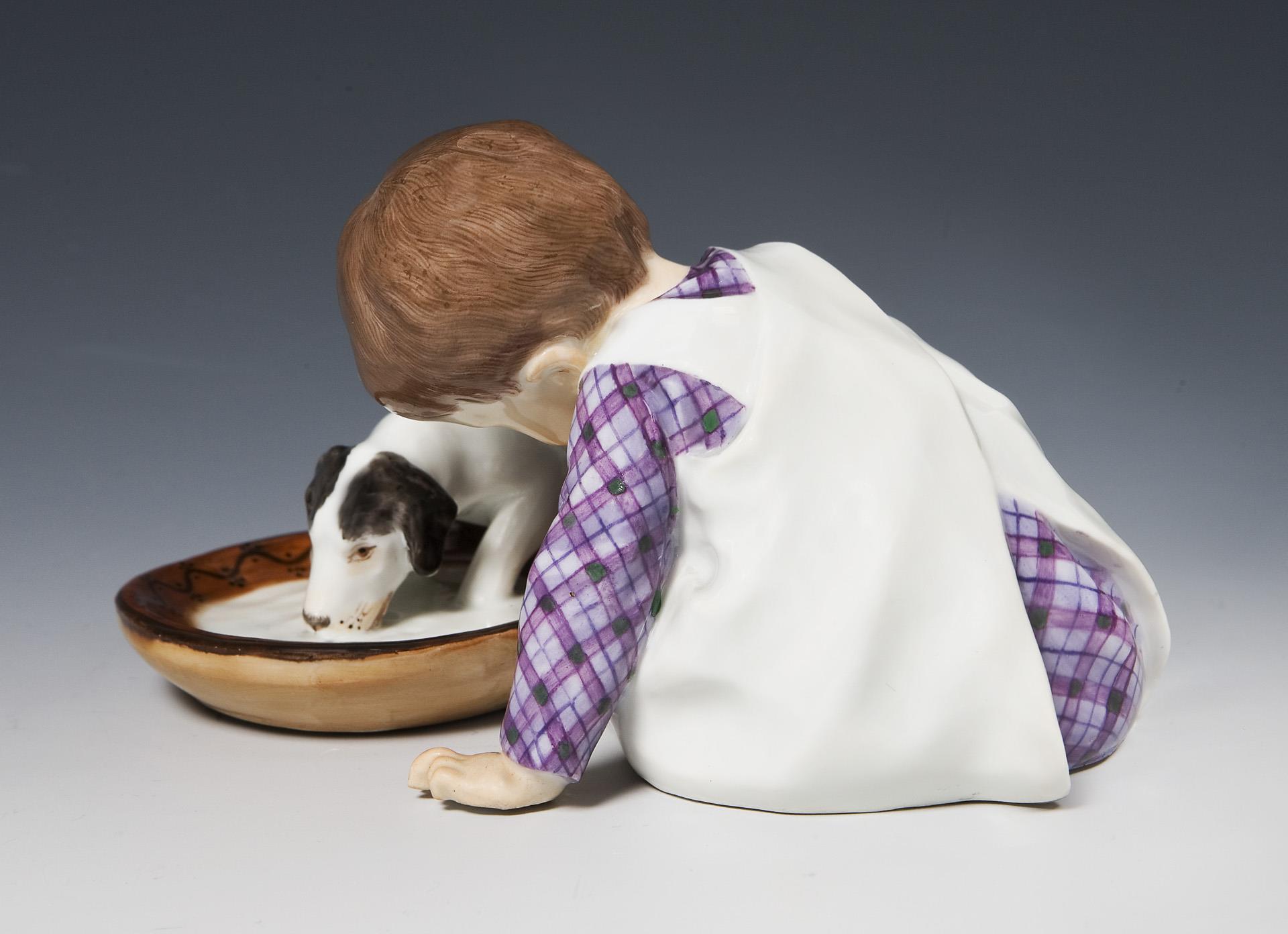 Jugendstil-Figur: Kind mit saufendem Hund. Meissen.
