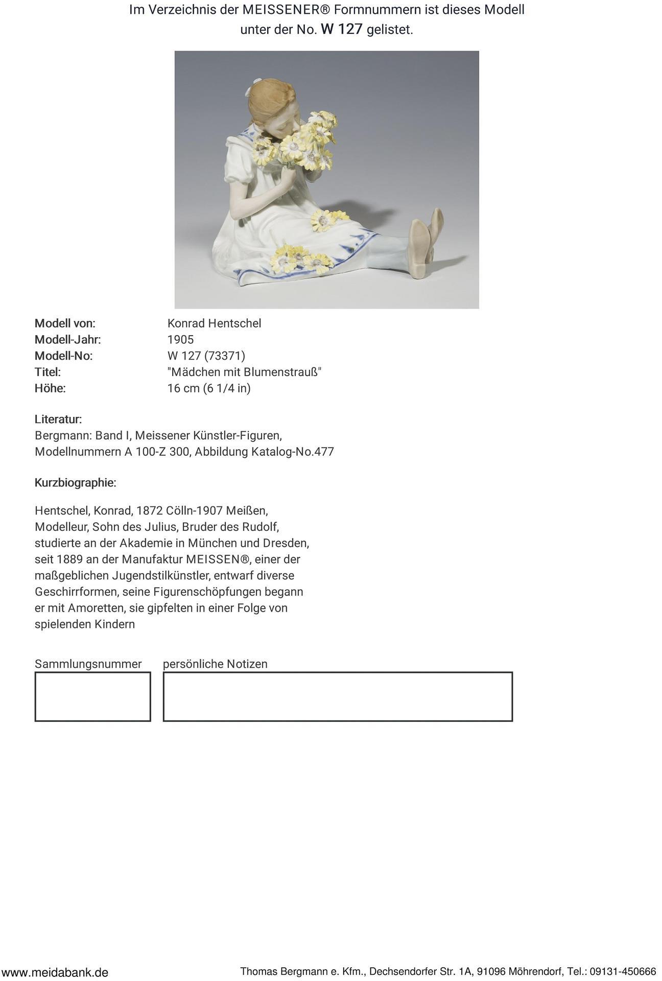 Ausformung 1905-1923. Modell-Jahr: 1905, Modell-Nr.W 127 (neue Form-Nr. 73371). Modell von. HENTSCHEL, Konrad(1872 Cölln - 1907 Meißen)