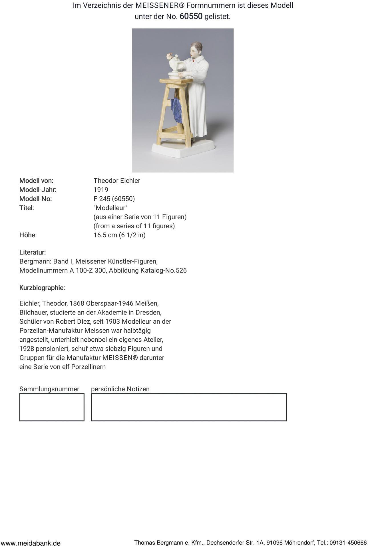 * Eichler, Bildhauer, Porzellanmodelleur, studierte an der Kunstgewerbeschule und Akademie in Dresden. Seit 1886 an der Porzellan-Manufaktur Meissen, unterhielt nebenbei ein eigenes Atelier, 1928 pensioniert. Ab 1899 regelmäßig auf deutschen Kunstausstellungen vertreten, erhielt diverse Auszeichnungen * Meissen-Manufaktur-Preis: 3290,- Euro.