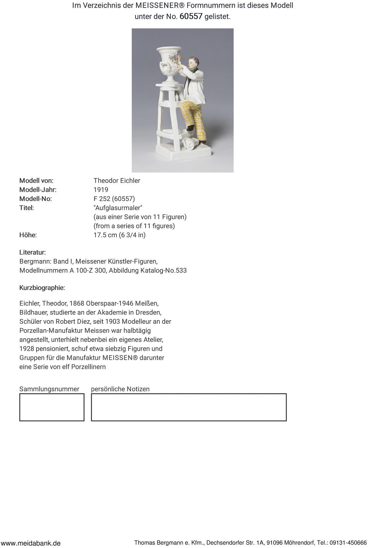 * Eichler, Bildhauer, Porzellanmodelleur, studierte an der Kunstgewerbeschule und Akademie in Dresden. Seit 1886 an der Porzellan-Manufaktur Meissen, unterhielt nebenbei ein eigenes Atelier, 1928 pensioniert. Ab 1899 regelmäßig auf deutschen Kunstausstellungen vertreten, erhielt diverse Auszeichnungen * Meissen-Manufaktur-Preis: 3690,- Euro.