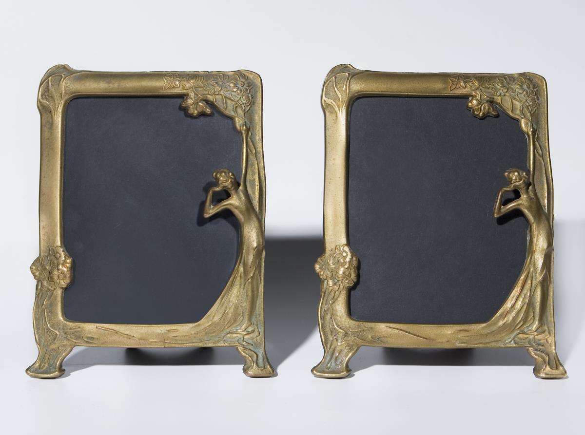 Messing-Bronze, gegossen, floral reliefiert. Seitlich halbplastische Mädchen-Figuren. Originale Glasscheiben. Originale Karton-Rückwände mit klappbaren Ständern. Klappbare Ständer defekt.