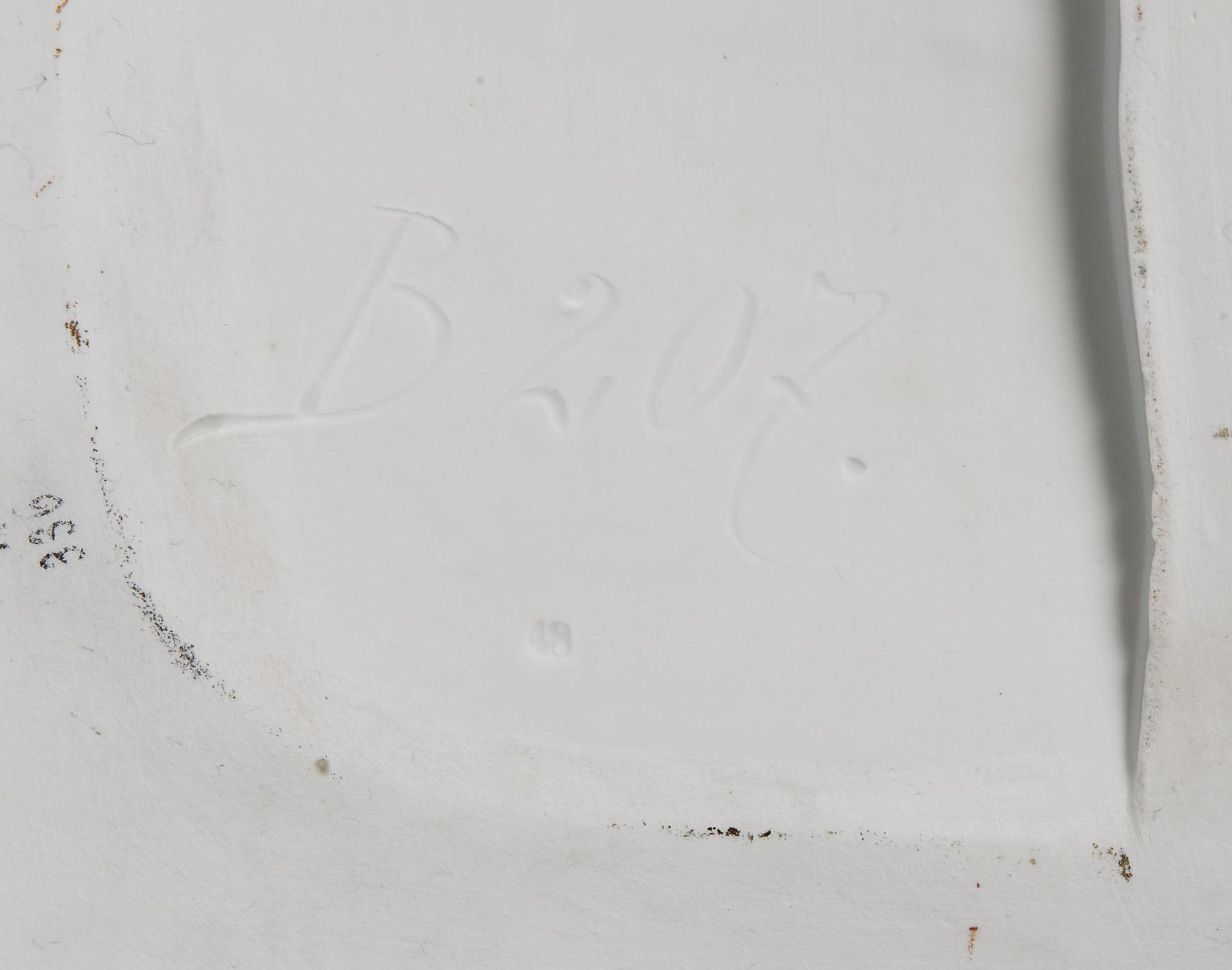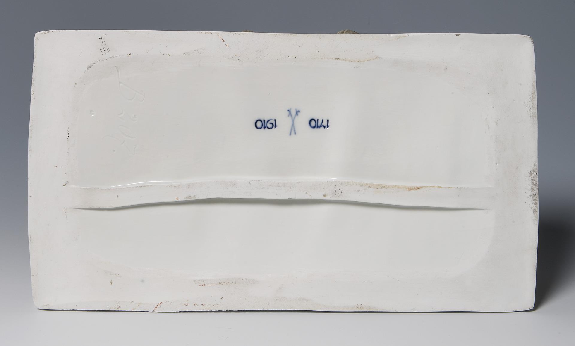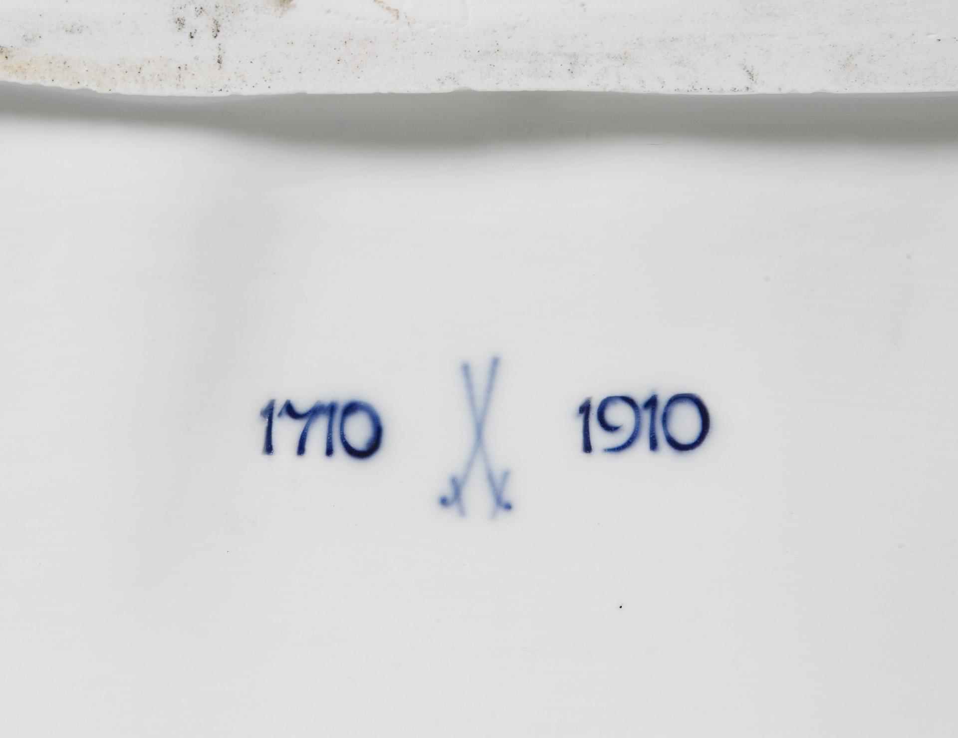 Farbige Unterglasurbemalung. Ritzmarke, Pressmarke, Malermarke, Schwertermarke, blaue Jubiläumsmarke 1710-1910, Künstler-Signet. Kleiner Glasurdefekt am Sockelrand.