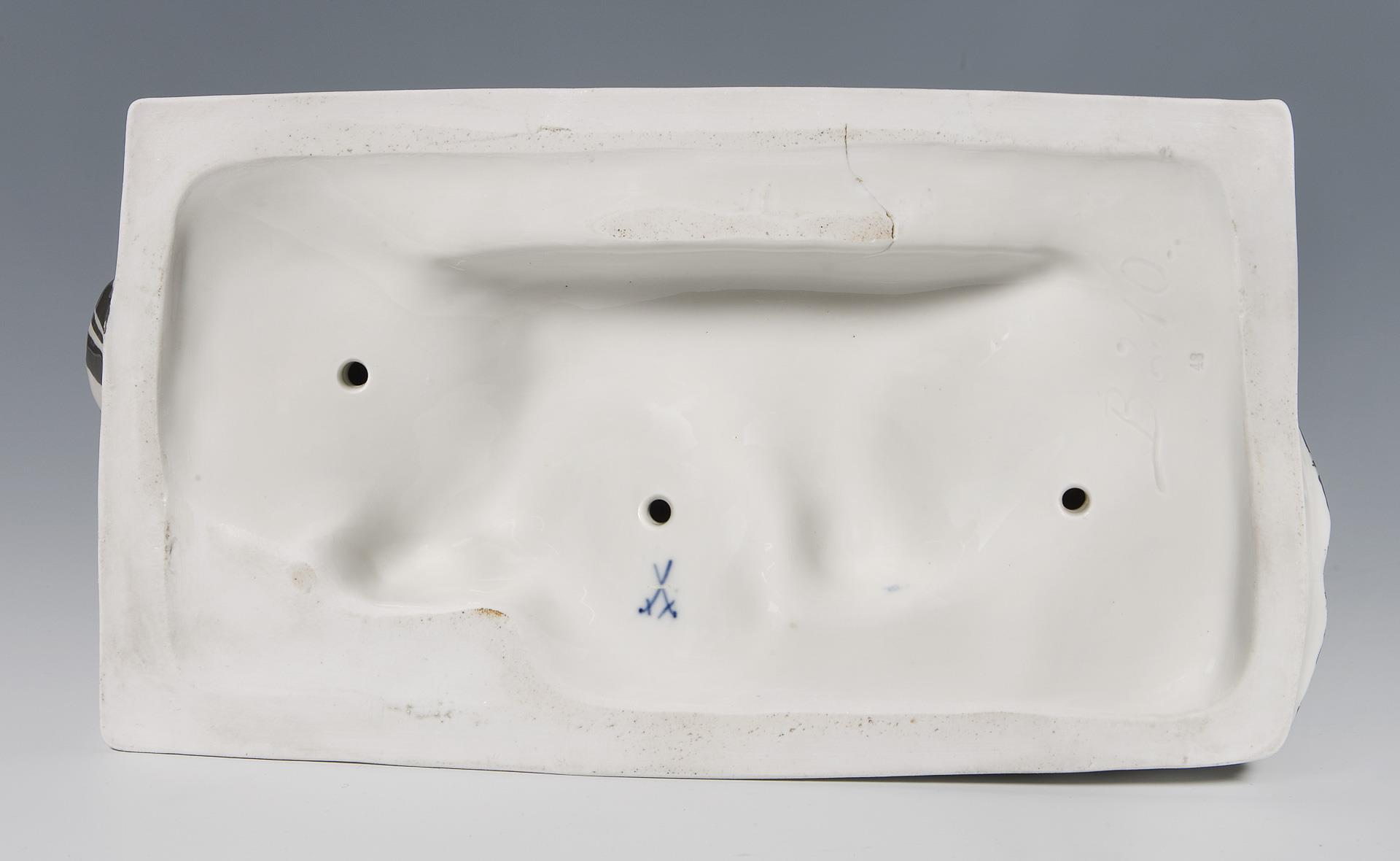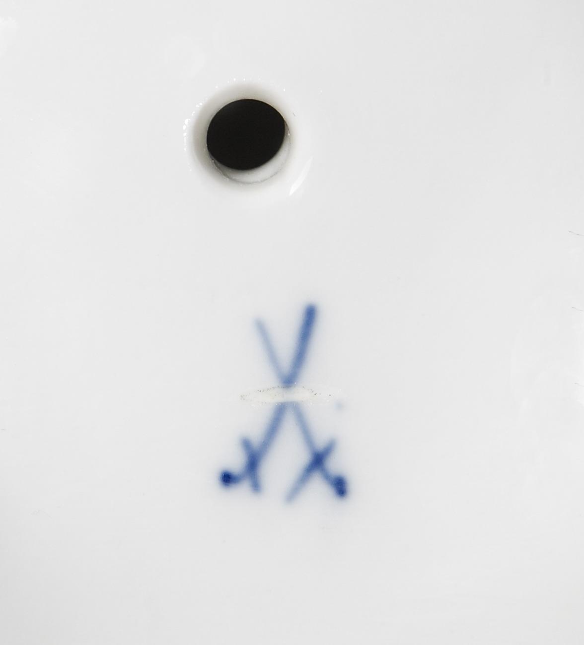 Farbige Unterglasurbemalung. Ritzmarke, Pressmarke, Schwertermarke einmal gestrichen. Kleiner Glasurdefekt im Sockel, kleiner Brandriss im Sockelboden.