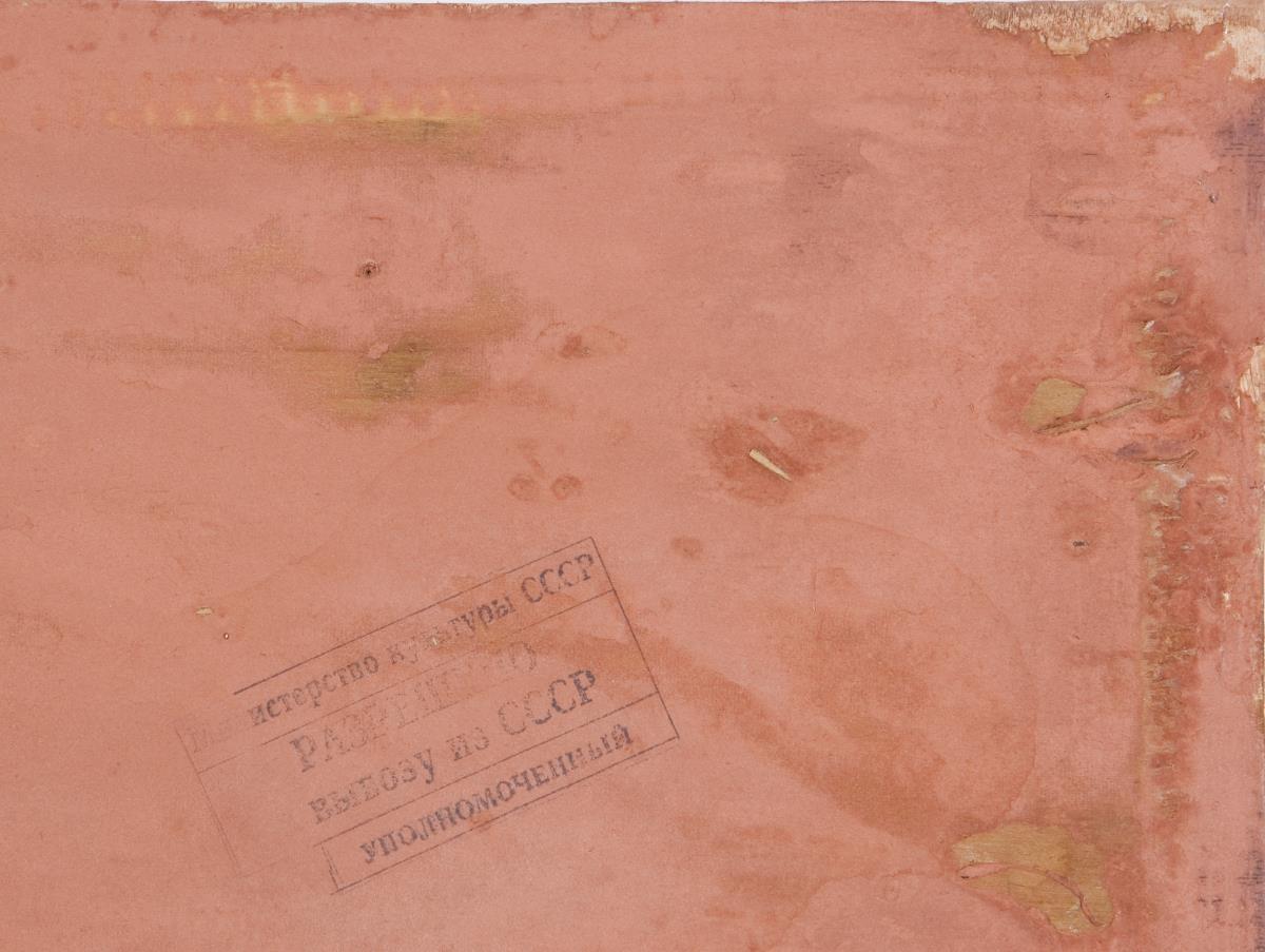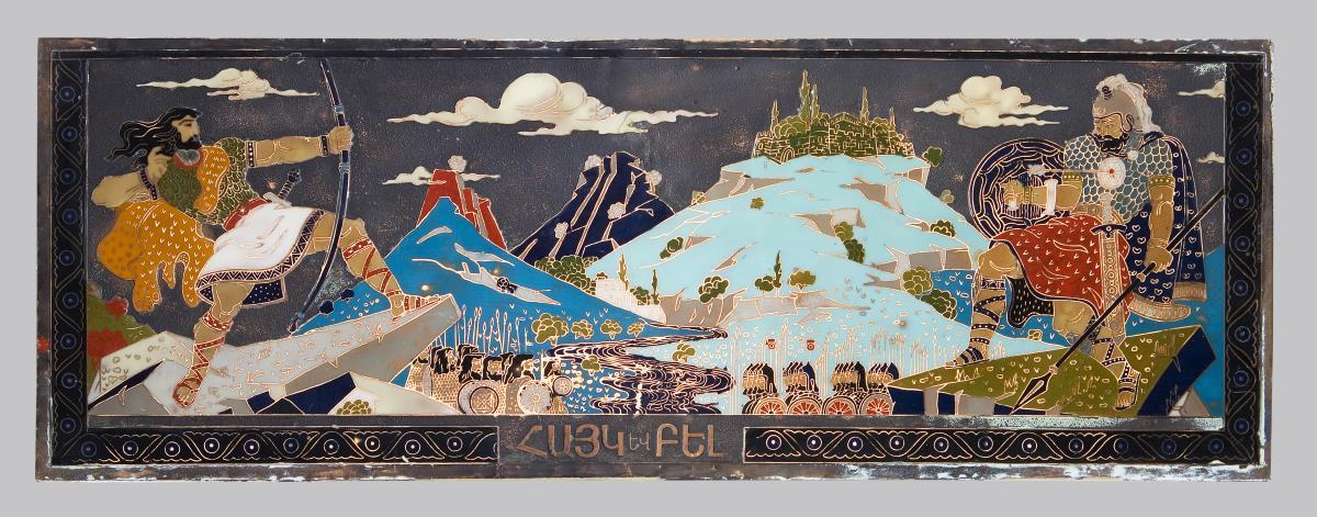 Im Vordergrund zwei monumental aufgestellte gegnerische Krieger, unten aufgestellt die feindlichen Heere. Frontal armenische Schriftzüge. Rückseitig kyrillischer Stempel. Ohne Rahmen. Partiell kleinere Defekte.