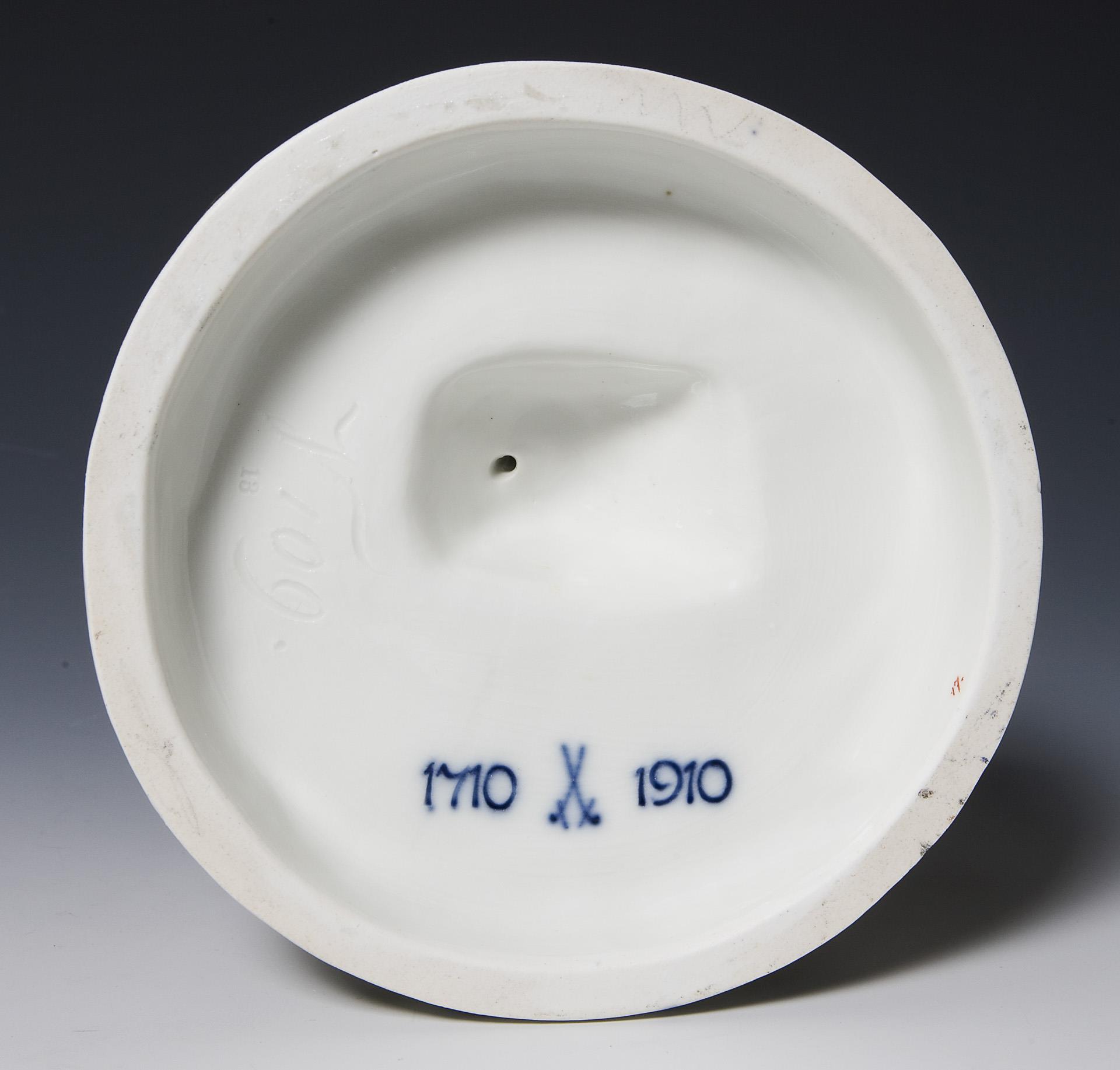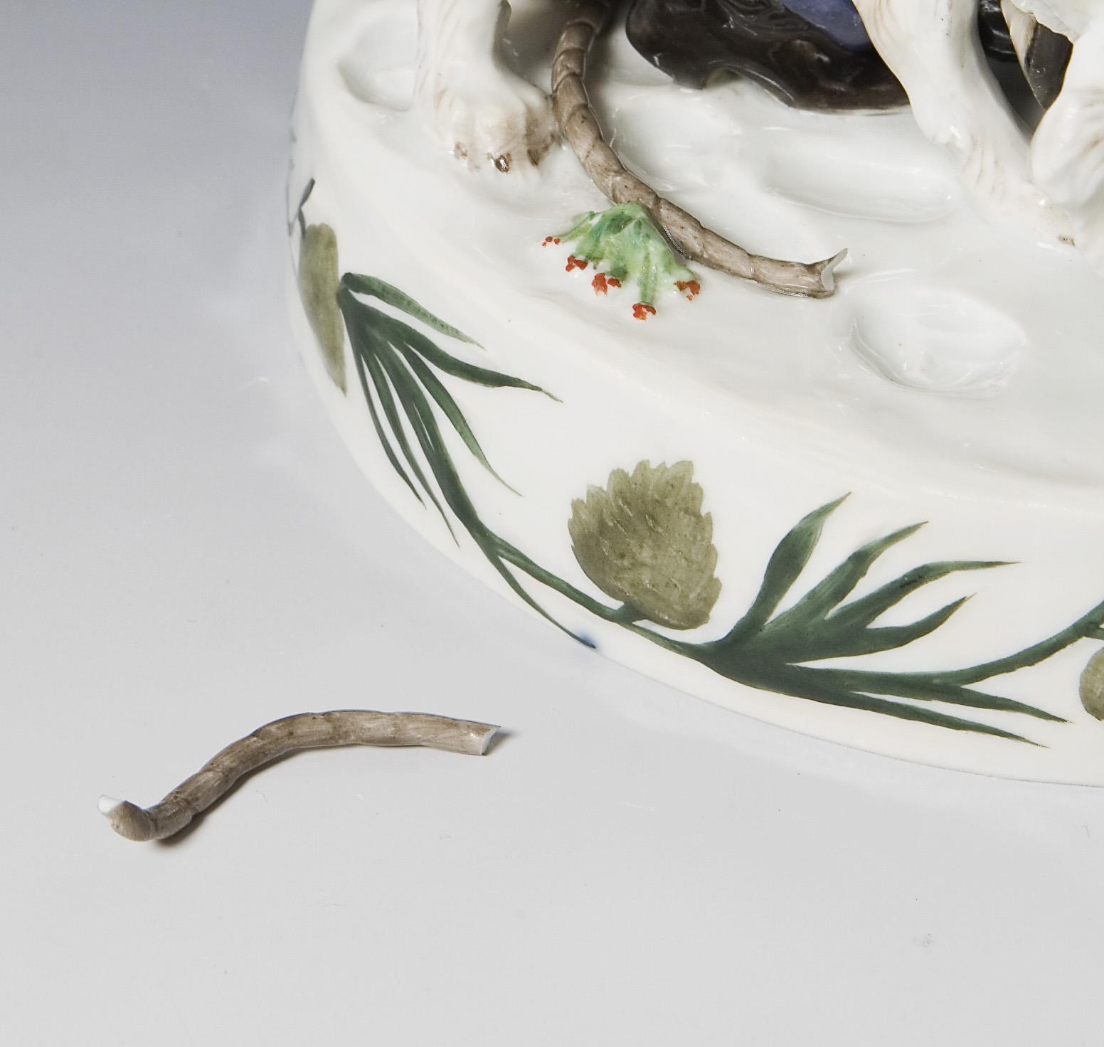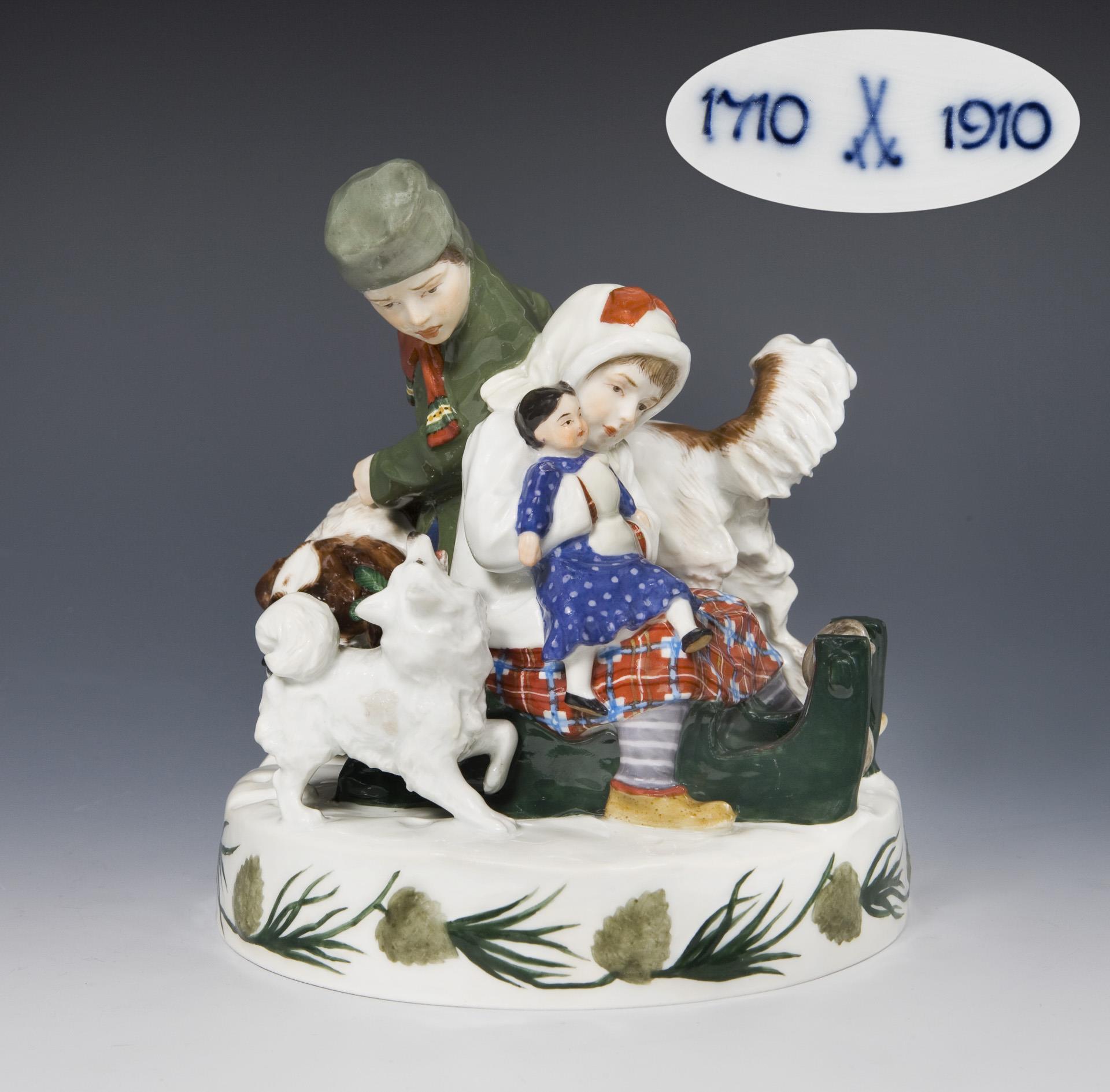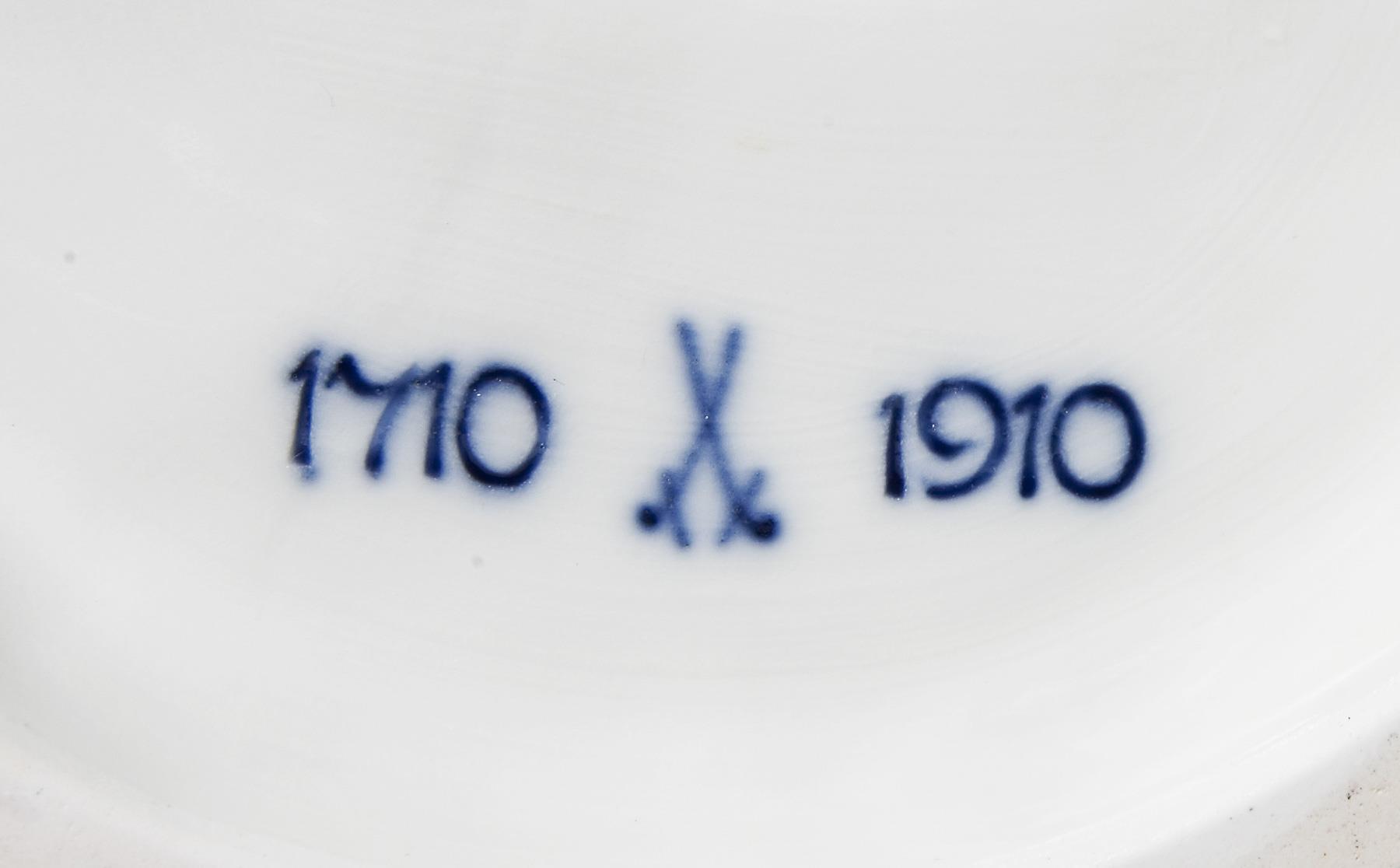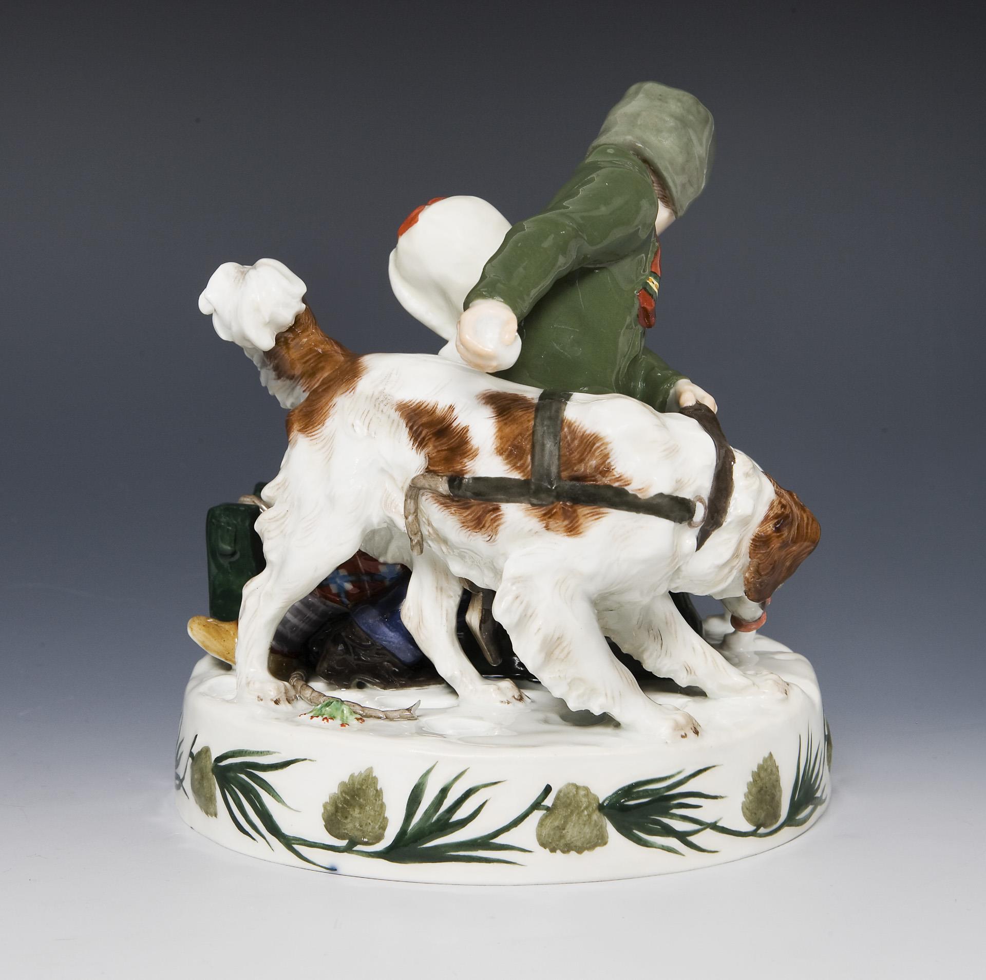 Sehr detailreich modelliert, farbig bemalt. Ritzmarke, Pressmarke, Malermarke, Schwertermarke, blaue Jubiläumsmarke 1710-1910. Ein Stück Leine original lose vorhanden.