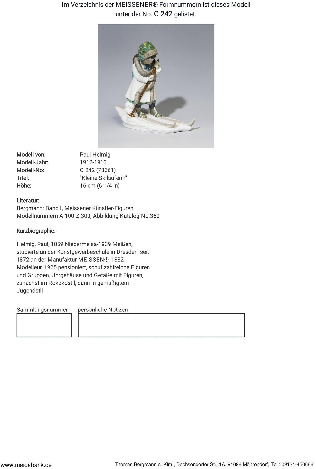 * Helmig, Modelleur, studierte an der Kunstgewerbeschule in Dresden. Seit 1872 an der Manufaktur Meissen, 1925 pensioniert. Schuf zahlreiche Figuren und Gruppen, Uhrgehäuse und Gefäße mit Figuren, zunächst im Rokokostil, dann in gemäßigtem Jugendstil * Meissen-Manufaktur-Preis: 2290,- Euro.