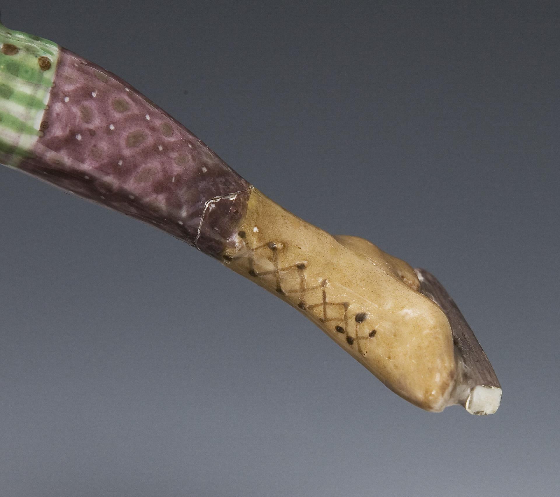 Farbig bemalt. Ritzmarke, Pressmarke, Malermarke, Schwertermarke. Rückseitig ein Fuß geklebt, Kufenspitze bestoßen, rückseitig am Handgelenk kleiner Brandriss.