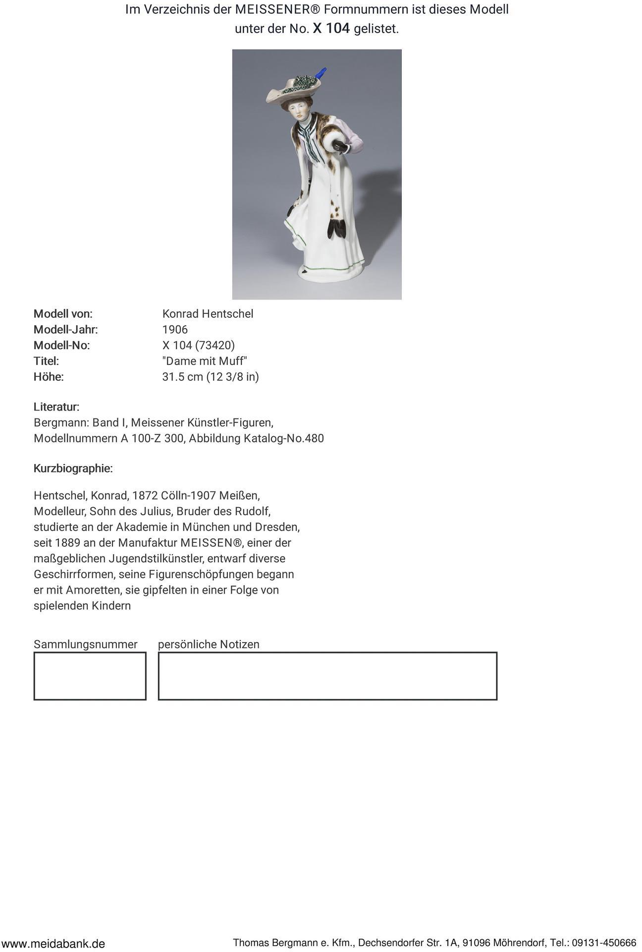 Ausformung 1906-1923. Modell-Jahr: 1906, Modell-Nr. X 104 (neue Form-Nr. 73420). Modell von. HENTSCHEL, Konrad(1872 Cölln - 1907 Meißen)