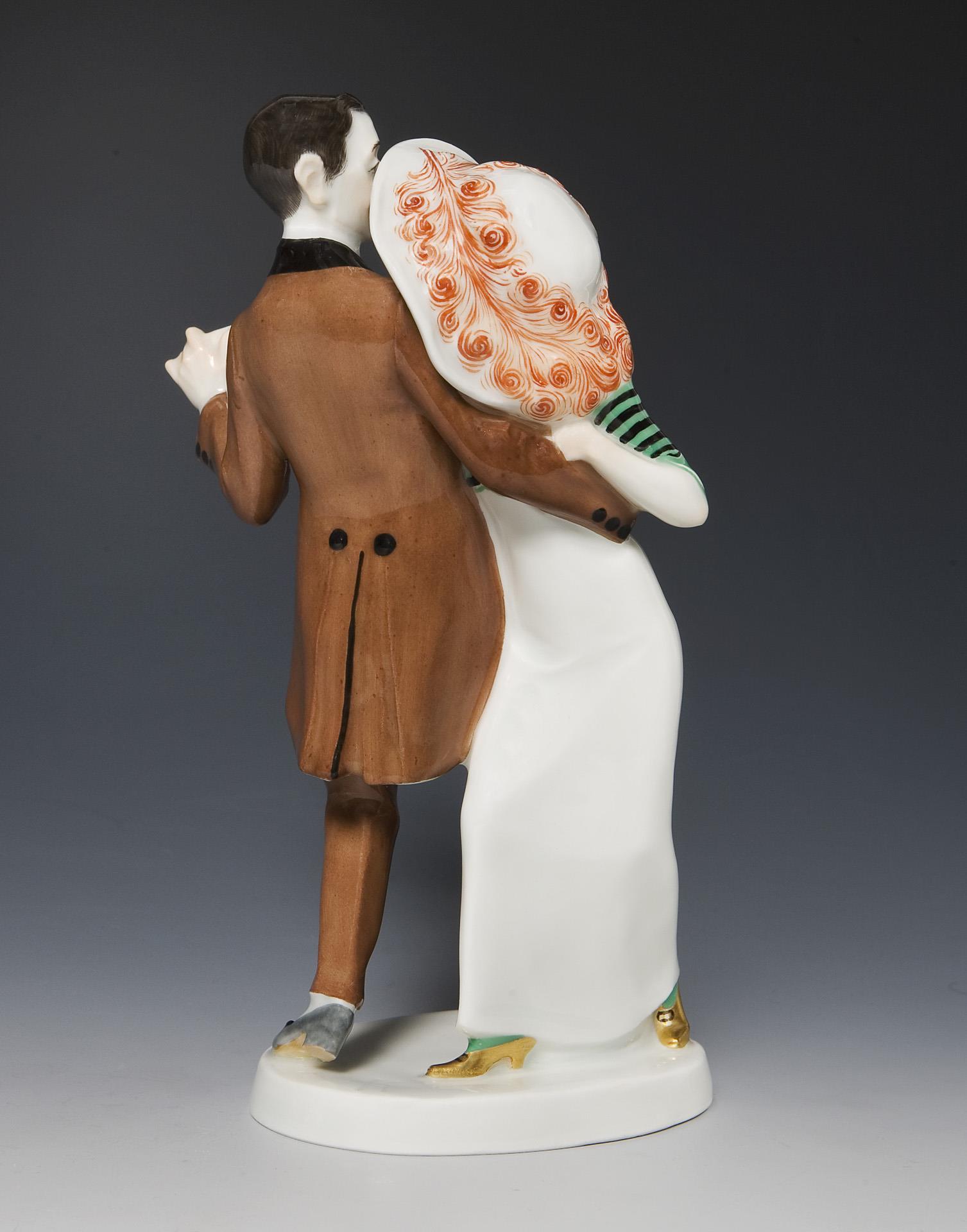 Pendant zu Modell-Nr. D 213 "Tango-Tanzpaar", farbig bemalt. Ritzmarke, Pressmarke, Malermarke, Schwertermarke, Künstler-Signet. Je ein kleiner Abplatzer am Führungsarm.
