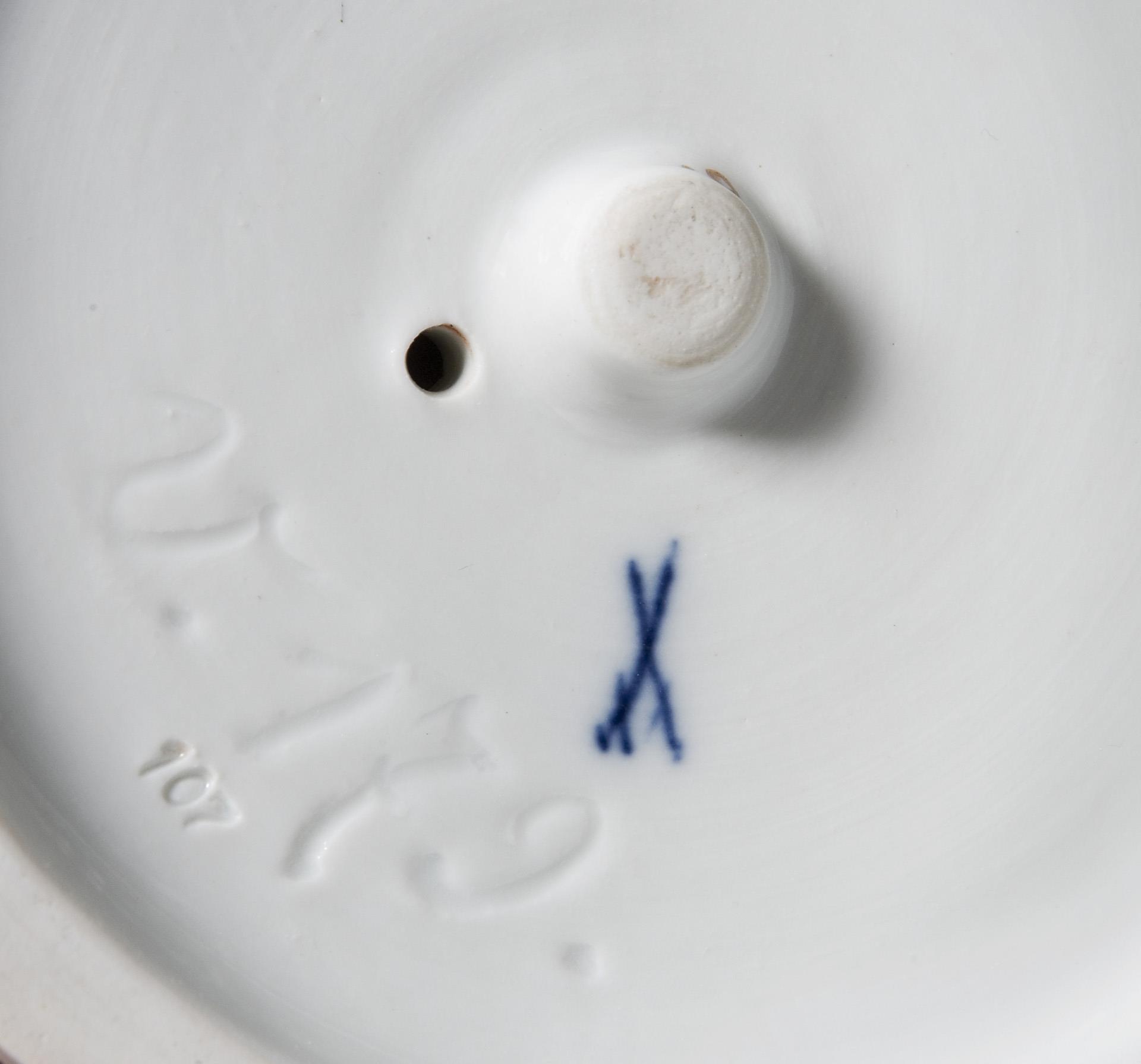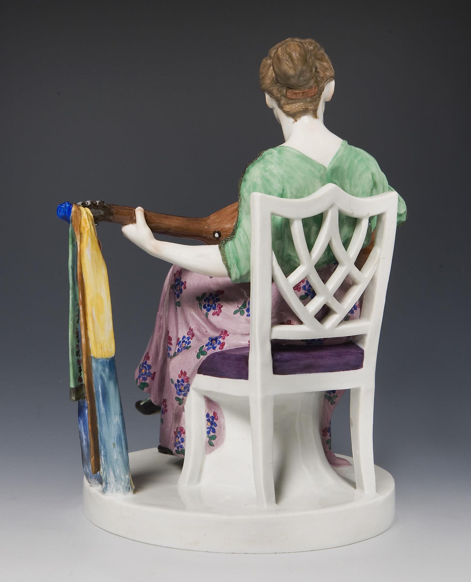 Farbig bemalt. Ritzmarke, Pressmarke, Malermarke, Schwertermarke. Ein Fuß, Ende des Lautensteges, Ende eines Bandes restauriert, rückseitig im Stuhl kleiner Brandriss, kleiner Glasurdefekt.