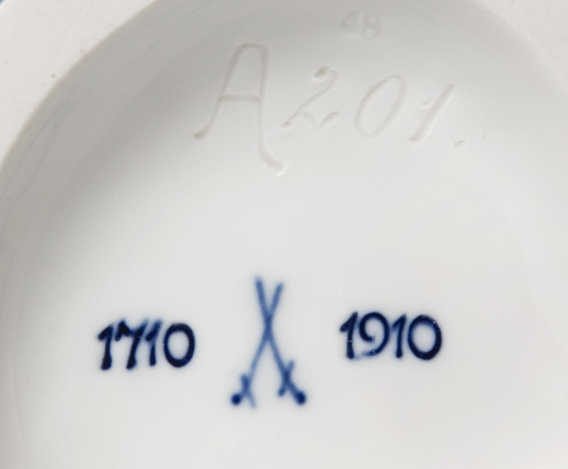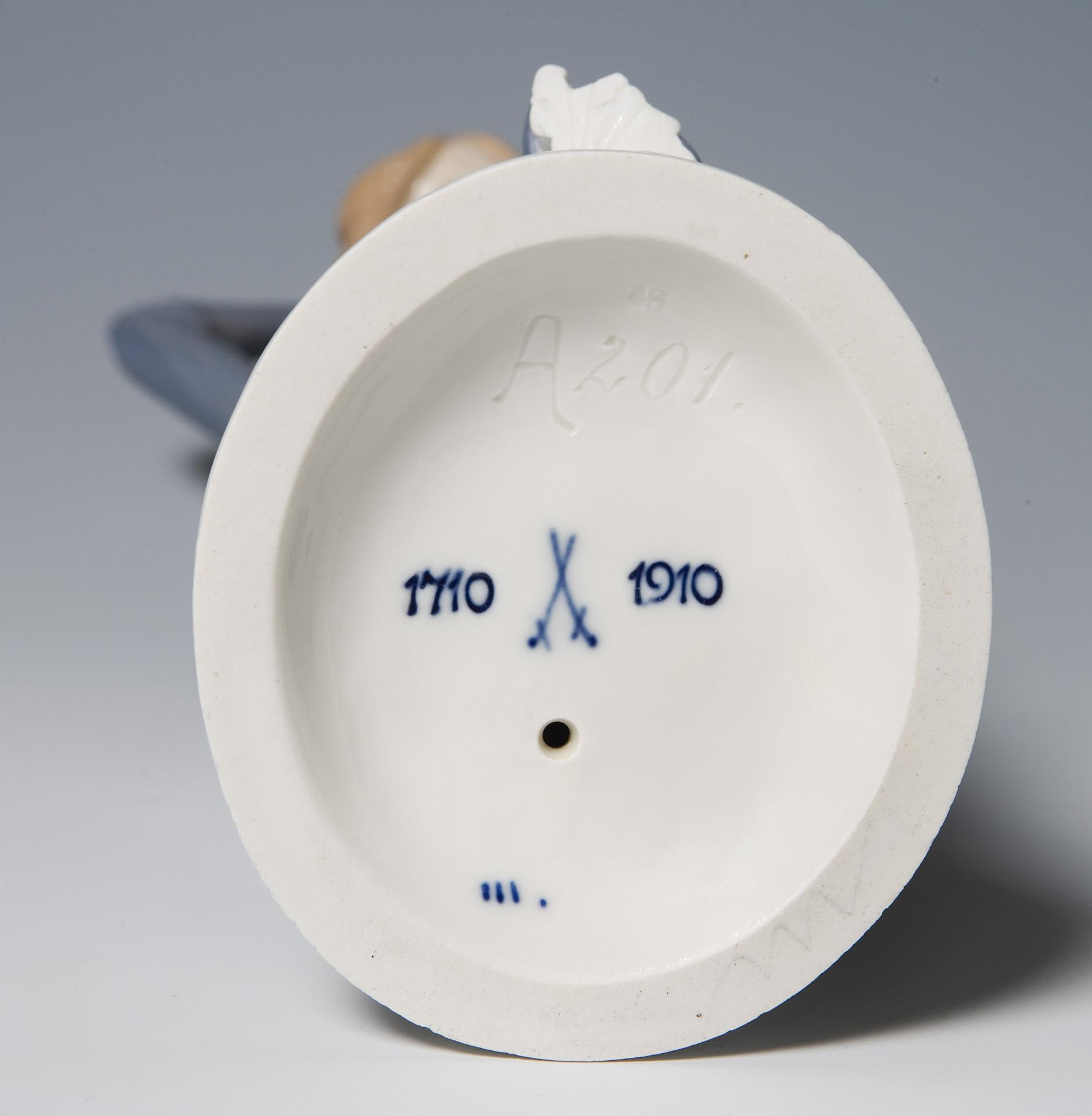 Farbige Unterglasurbemalung. Ritzmarke, Pressmarke, Malermarke, Schwertermarke, blaue Jubiläumsmarke 1710-1910. Sockelrand kaum erkennbar minimal bestoßen.