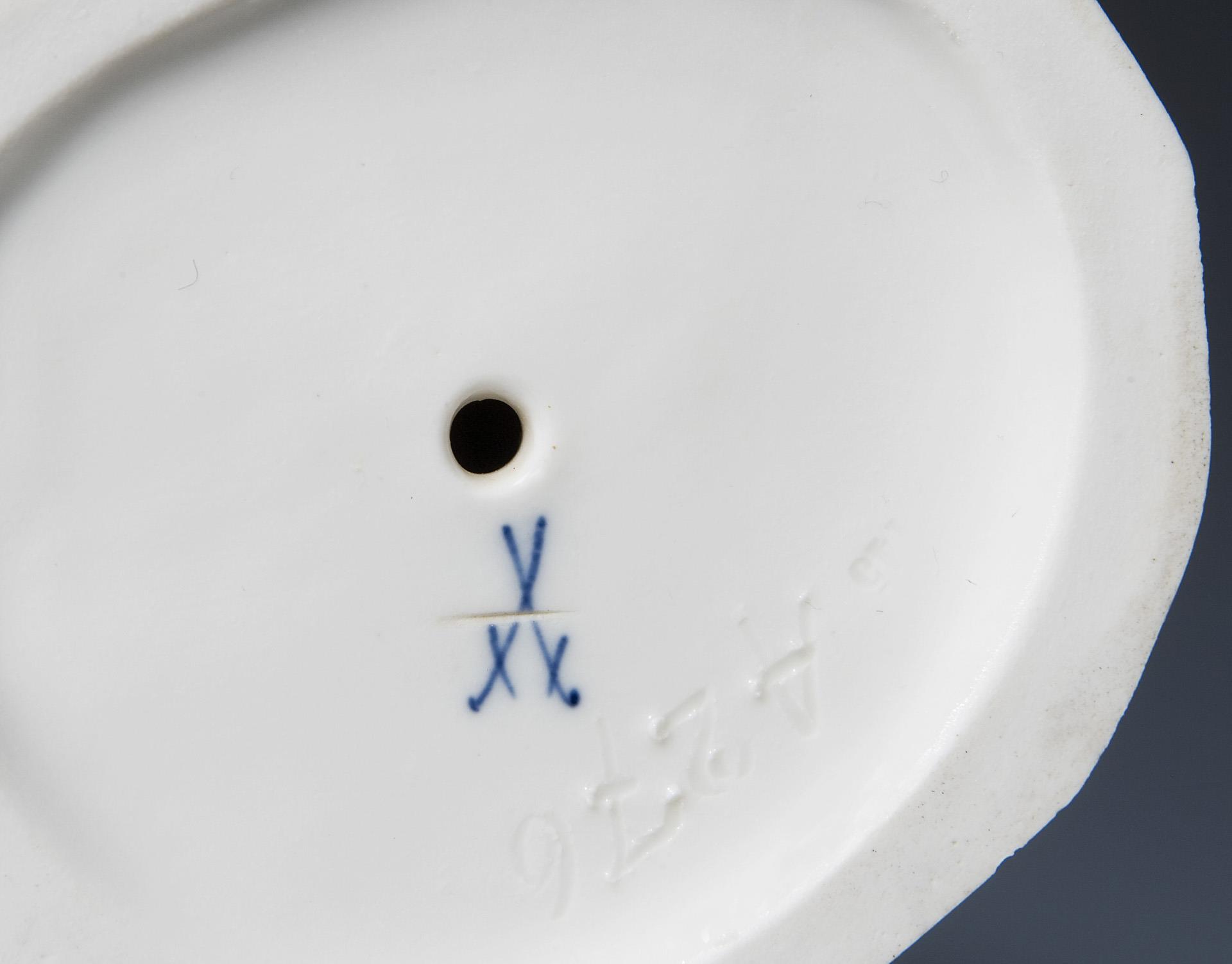 Farbige Unterglasurbemalung. Ritzmarke, Pressmarke, Malermarke, Schwertermarke einmal gestrichen. Partiell kleine Brandrisse, Sockelrand minimal bestoßen.