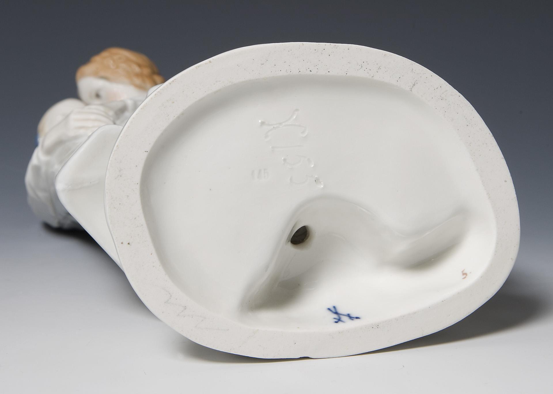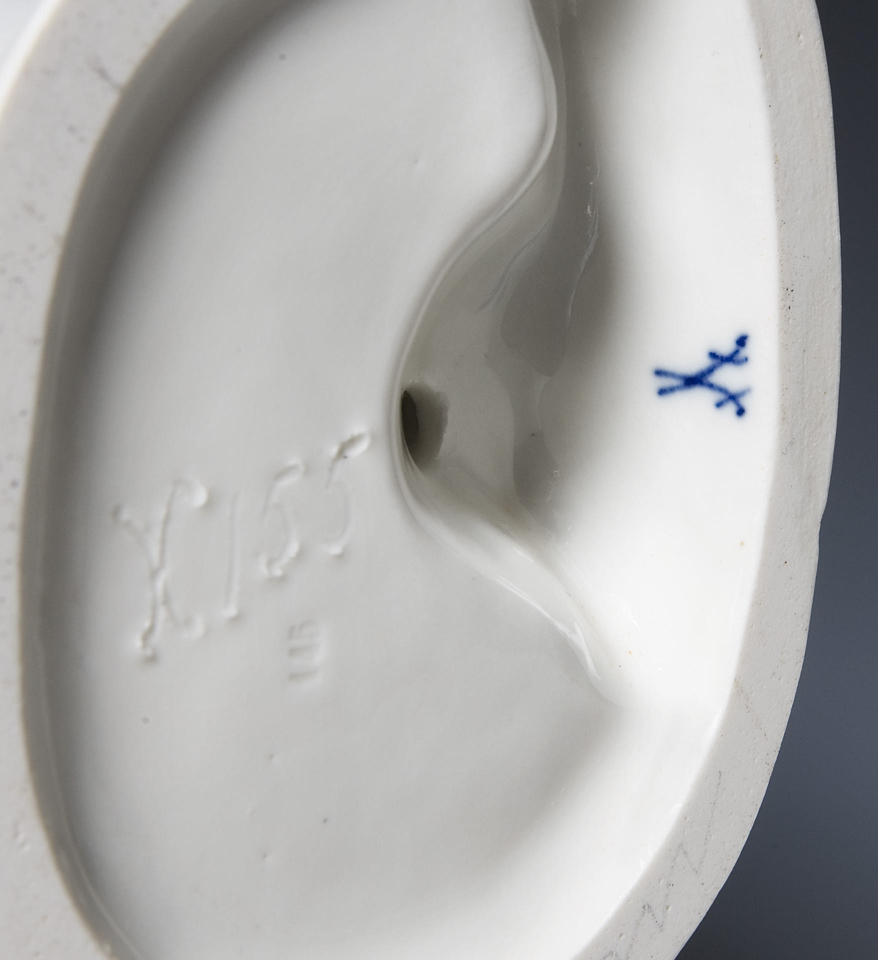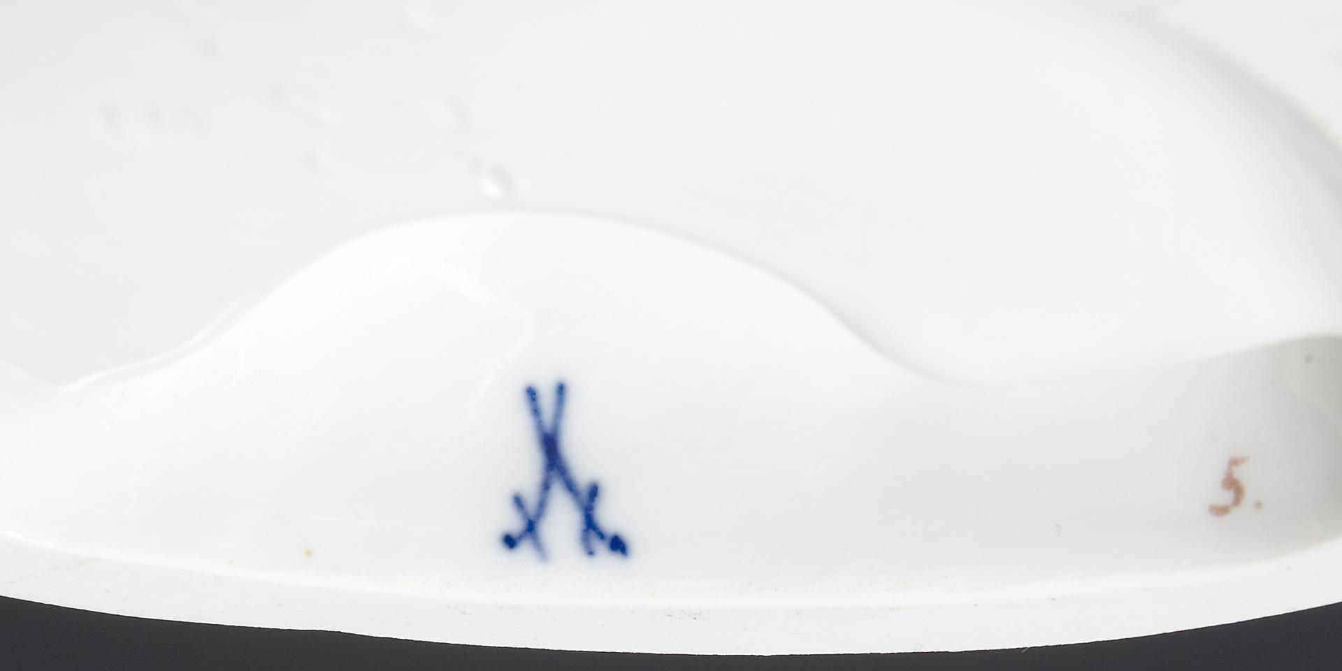Farbige Unterglasurbemalung. Ritzmarke, Pressmarke, Malermarke, Schwertermarke. Minimaler Glasurdefekt rückseitig am Sockelrand.