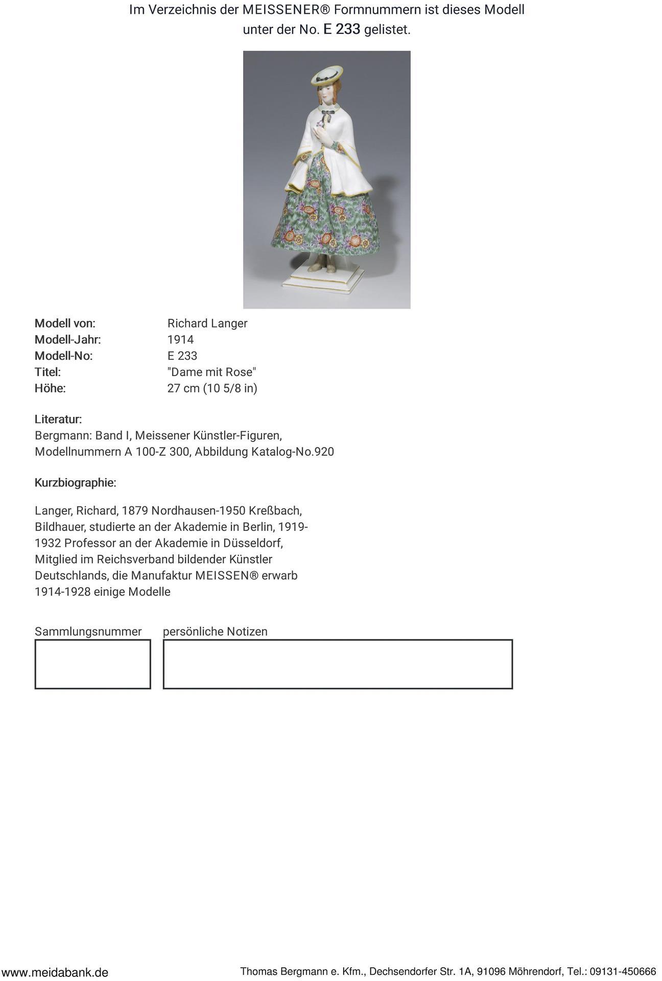 Ausformung 1914-1923. Modell-Jahr: 1914, Modell-Nr. E 233. Modell von. LANGER, Richard(1879 Nordhausen - 1950 Kreßbach)