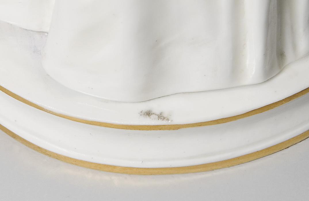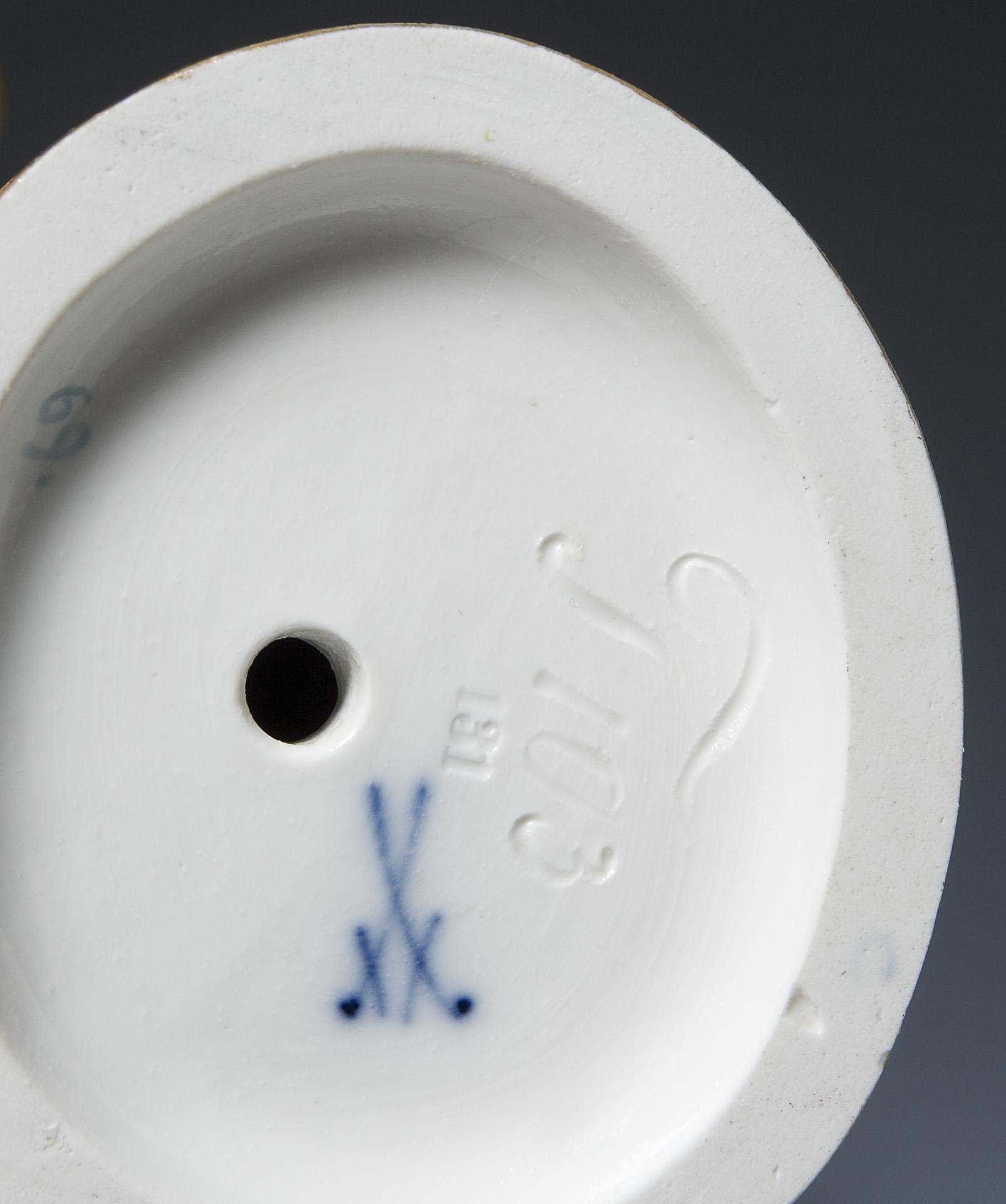 Farbig und gold staffiert. Ritzmarke, Pressmarke, Malermarke, Schwertermarke. Hals fachmännisch restauriert, rückseitig am Sockel kleiner Glasurdefekt.