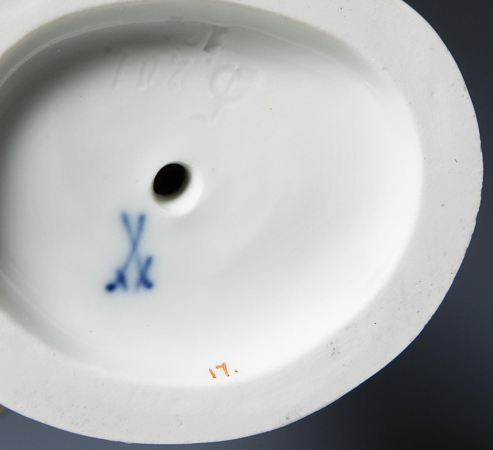 Farbig bemalt, gold staffiert. Ritzmarke, Pressmarke, Malermarke, Schwertermarke. Gold am Apfel partiell berieben.