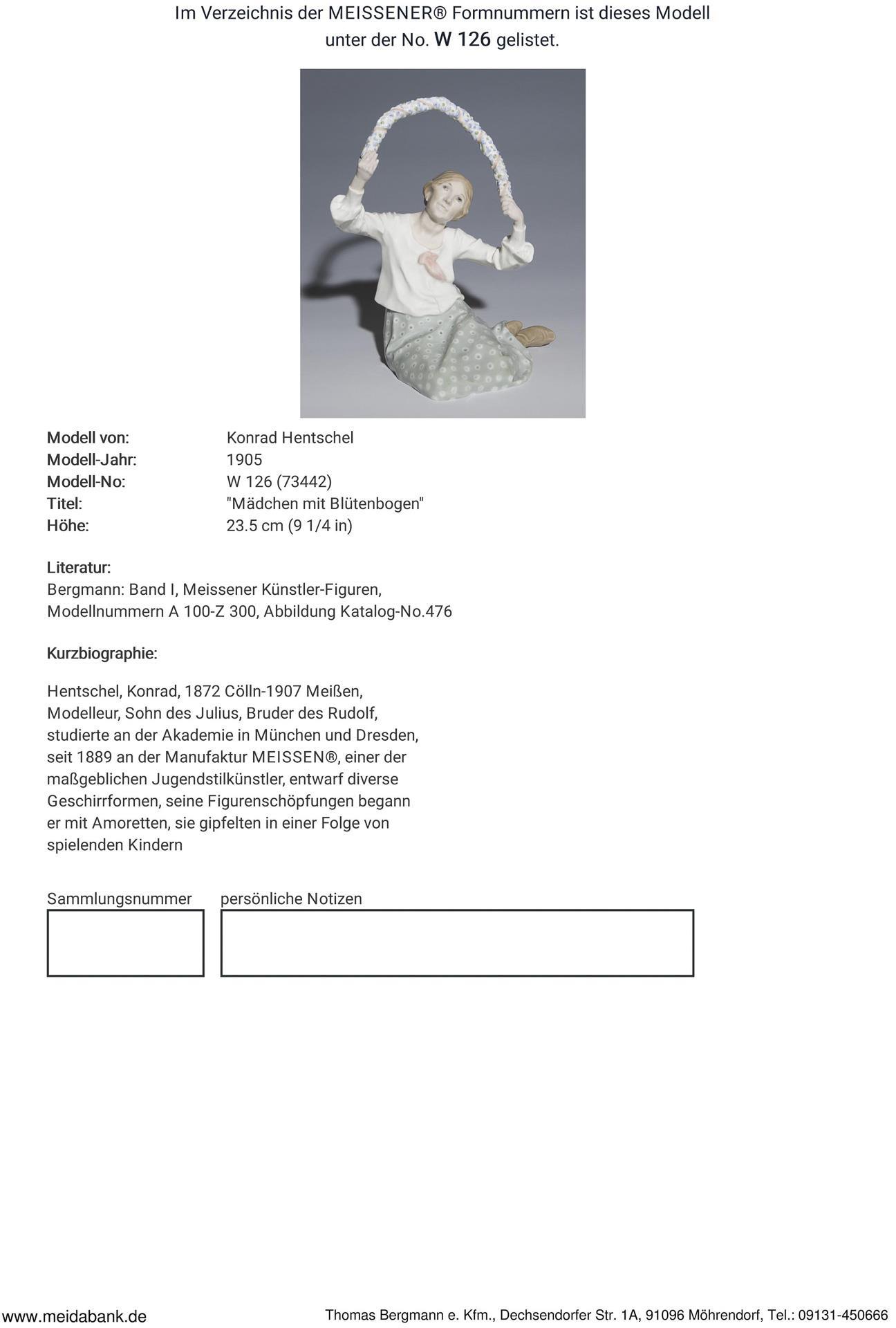 Ausformung 1905-1923. Modell-Jahr: 1905, Modell-Nr. W 126 (neue Form-Nr. 73442). Modell von. HENTSCHEL, Konrad(1872 Cölln - 1907 Meißen)