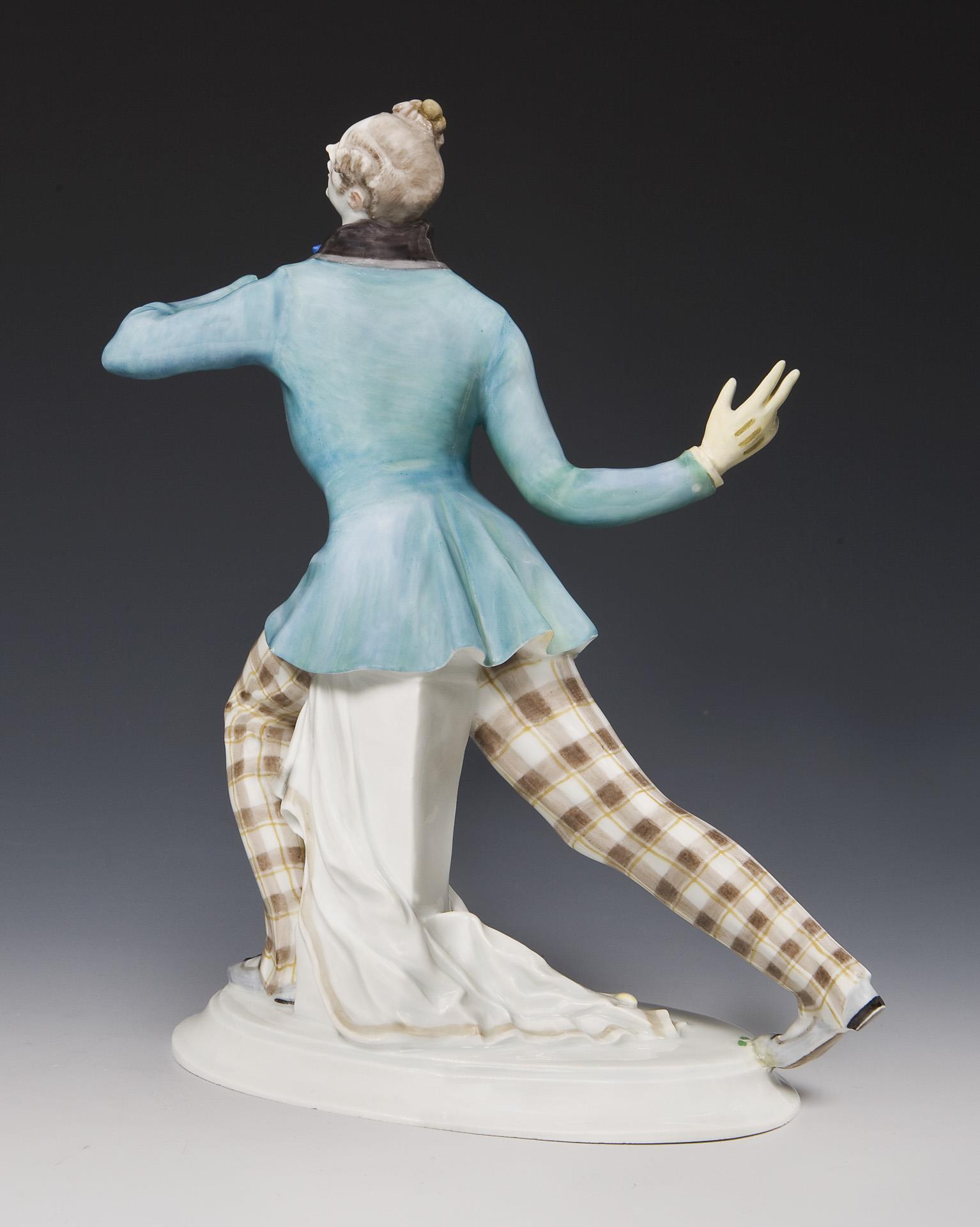 "Russischer Tänzer" aus dem Ballett "Karneval", aus einer Serie von 5 Figuren. Farbig bemalt, Ritzmarke, Pressmarke, Malermarke, Schwertermarke. Eine Hand, Hutkrempe partiell, eine Schuhspitze mit angrenzendem Sockelrand restauriert.