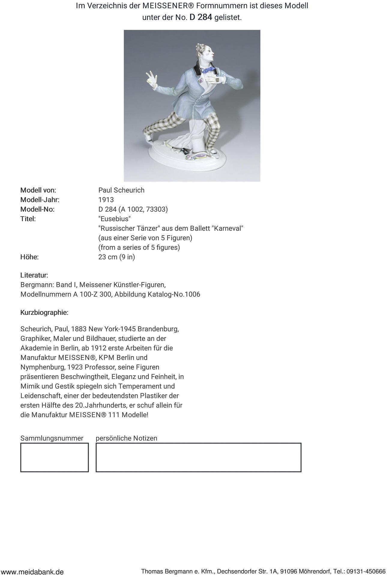 * Scheurich, Maler, Grafiker, Illustratior, Bildhauer, Modelleur, studierte an der Akademie in Berlin. Ab 1912 erste Arbeiten für die Manufaktur Meissen, KPM Berlin und Nymphenburg. 1924 Titular-Professor, seine Figuren präsentieren Beschwingtheit und Eleganz, in Mimik und Gestik spiegeln sich Temperament und Leidenschaft, einer der bedeutendsten Porzellanplatiker seiner Zeit * Meissen-Manufaktur-Preis: 8490,- Euro.