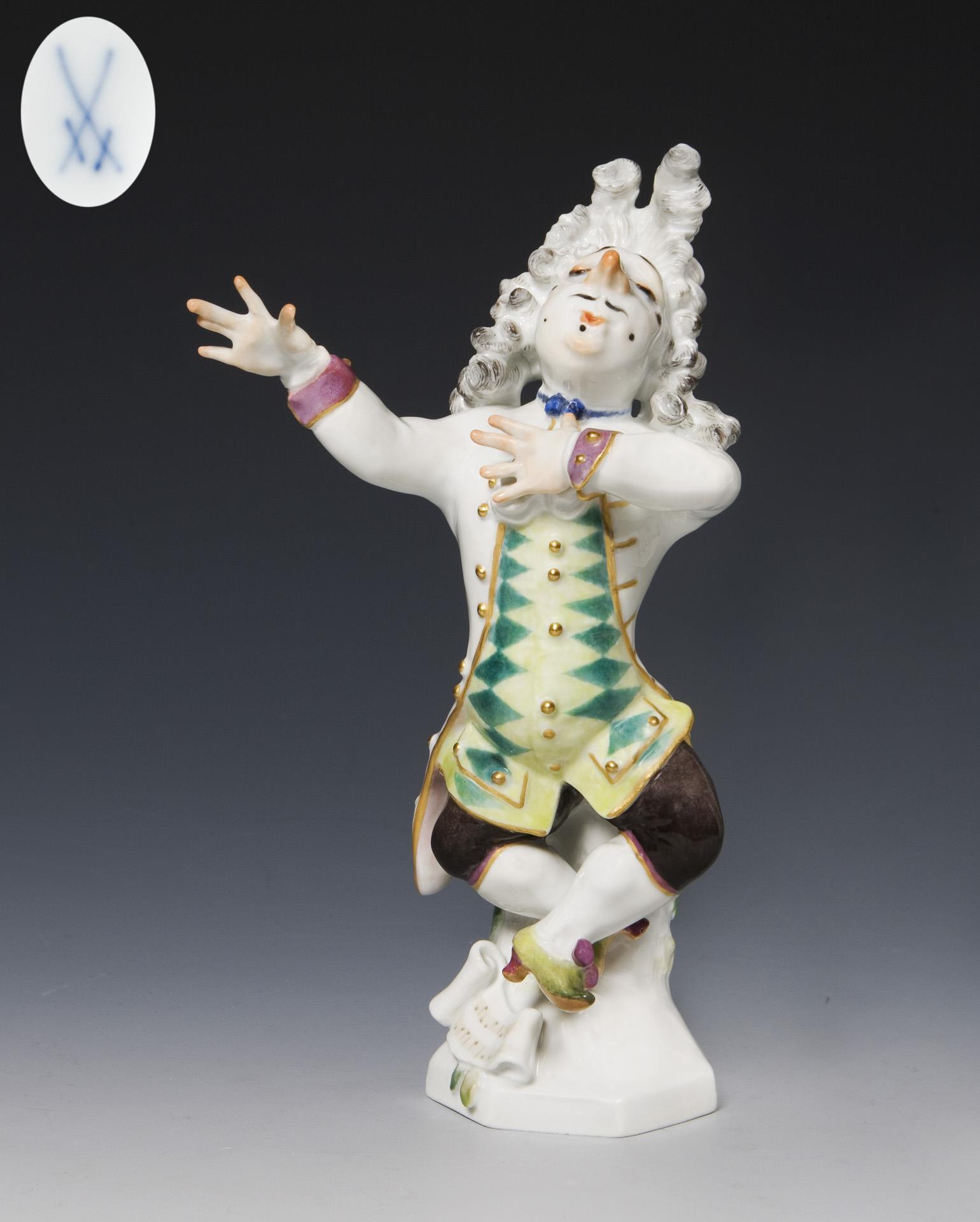 Aus einer Serie von 5 Figurenn, detailreich modelliert, farbig bemalt, gold staffiert. Er dirigiert mit geschlossenen Augen, diverse Schönheitspflästerchen (Mouche) im Gesicht. Pressmarken, Schwertermarke.