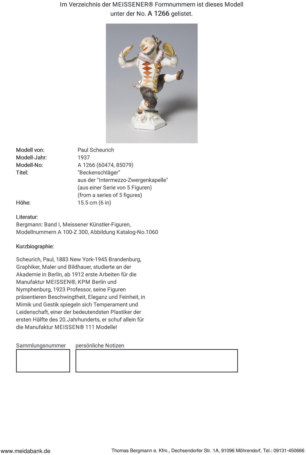 * Scheurich, Maler, Grafiker, Illustratior, Bildhauer, Modelleur, studierte an der Akademie in Berlin. Ab 1912 erste Arbeiten für die Manufaktur Meissen, KPM Berlin und Nymphenburg. 1924 Titular-Professor, seine Figuren präsentieren Beschwingtheit und Eleganz, in Mimik und Gestik spiegeln sich Temperament und Leidenschaft, einer der bedeutendsten Porzellanplatiker seiner Zeit * Meissen-Manufaktur-Preis: 3690,- Euro.