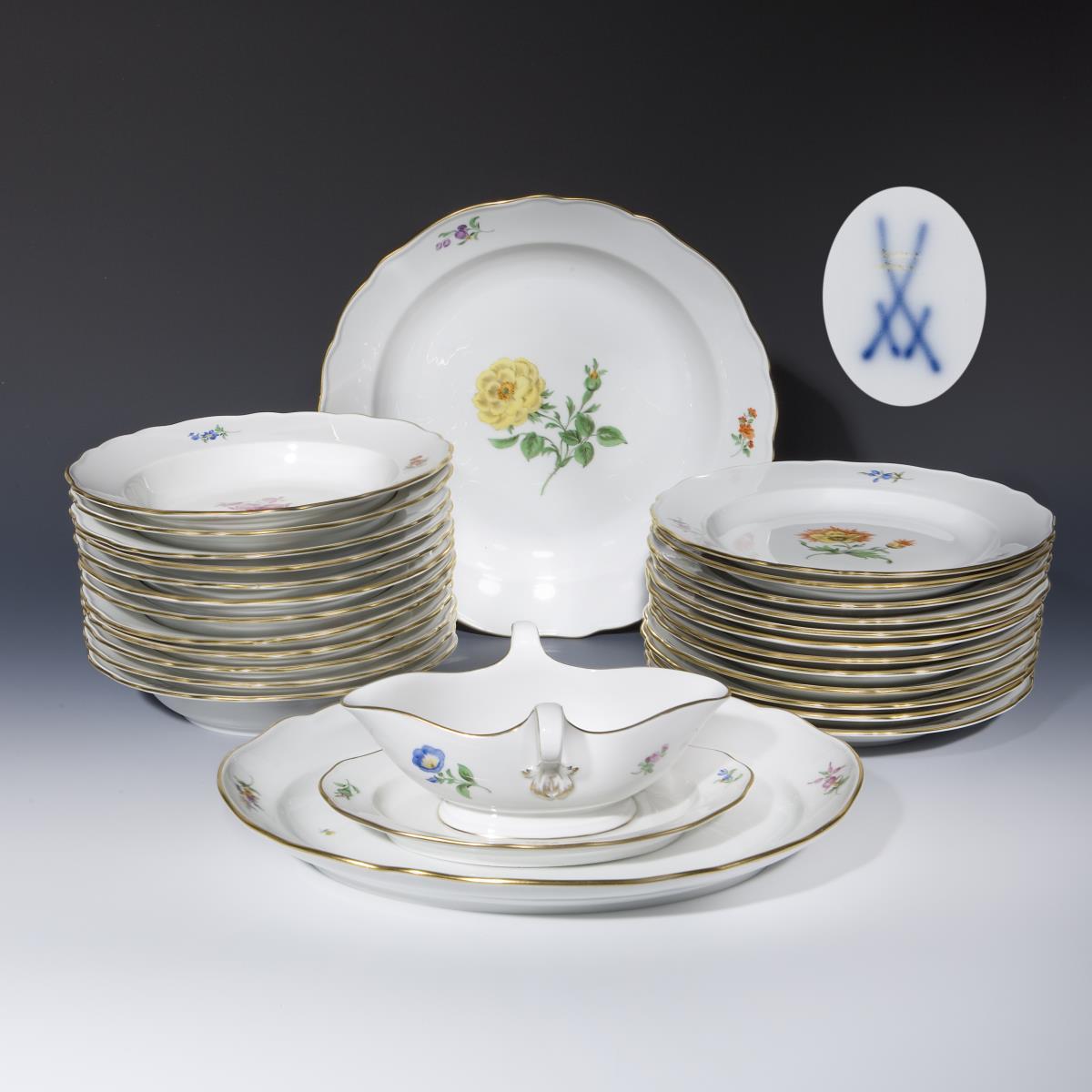 Komplett für 12 Personen: 12er Satz Suppenteller, 12er Satz Essteller, 1 ovale Platte, 1 Sauciere, 1 große runde Schale. Farbige Blumenbemalung, gold staffiert, Form "Neuer Ausschnitt". Pressmarken, Malermarken, Schwertermarken zweimal gestrichen.