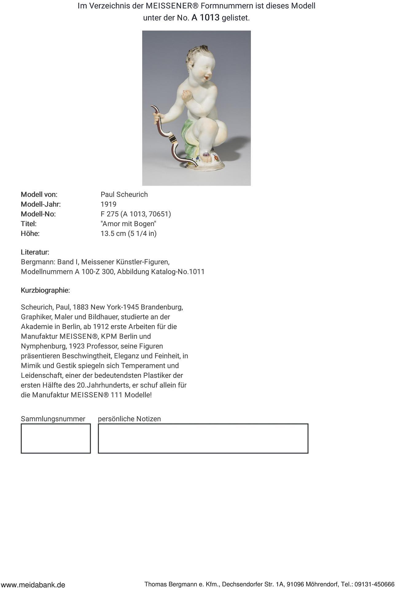 * Scheurich, Maler, Grafiker, Illustratior, Bildhauer, Modelleur, studierte an der Akademie in Berlin. Ab 1912 erste Arbeiten für die Manufaktur Meissen, KPM Berlin und Nymphenburg. 1924 Titular-Professor, seine Figuren präsentieren Beschwingtheit und Eleganz, in Mimik und Gestik spiegeln sich Temperament und Leidenschaft, einer der bedeutendsten Porzellanplatiker seiner Zeit * Meissen-Manufaktur-Preis: 2490,- Euro.