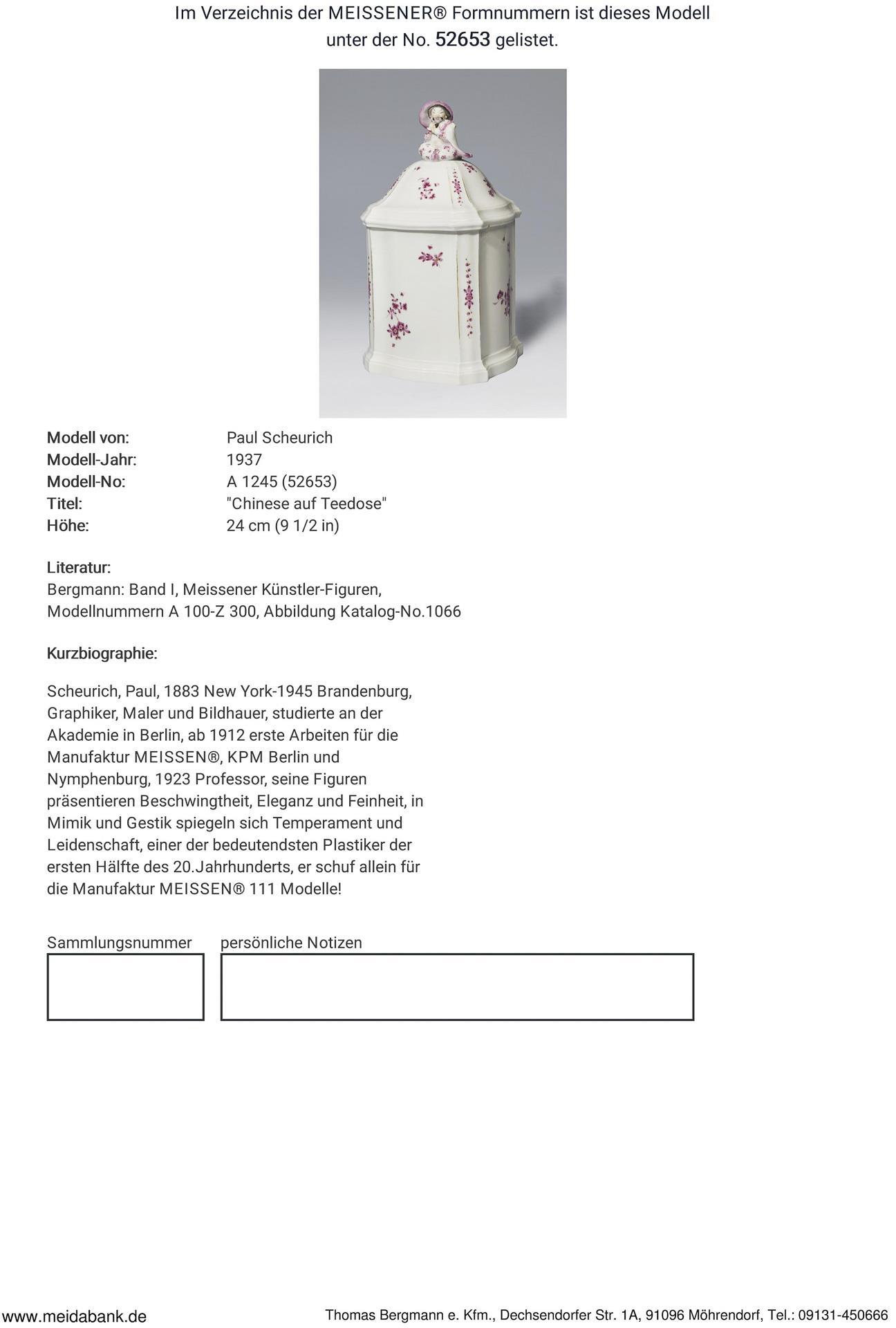 * Scheurich, Maler, Grafiker, Illustratior, Bildhauer, Modelleur, studierte an der Akademie in Berlin. Ab 1912 erste Arbeiten für die Manufaktur Meissen, KPM Berlin und Nymphenburg. 1924 Titular-Professor, seine Figuren präsentieren Beschwingtheit und Eleganz, in Mimik und Gestik spiegeln sich Temperament und Leidenschaft, einer der bedeutendsten Porzellanplatiker seiner Zeit * Meissen-Manufaktur-Preis: 4790,- Euro.
