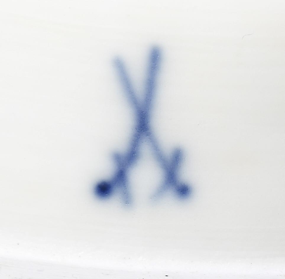Farbig bemalt, gold staffiert, Rundsockel mit reliefierten Reserven. Ritzmarke, Pressmarke, Schwertermarke. Minimaler Farbabplatzer am Sockel.