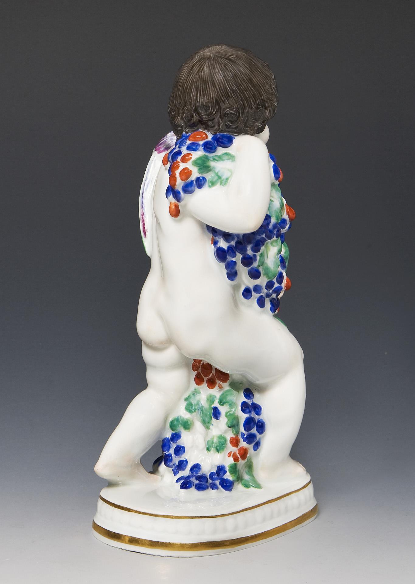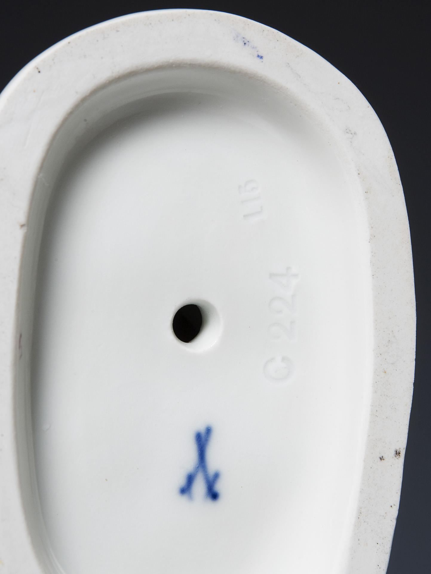 Farbig bemalt, gold staffiert. Ritzmarke, Pressmarke, Malermarke, Schwertermarke, Künstler-Signet. Kleiner Glasurdefekt an Wade und Ferse.