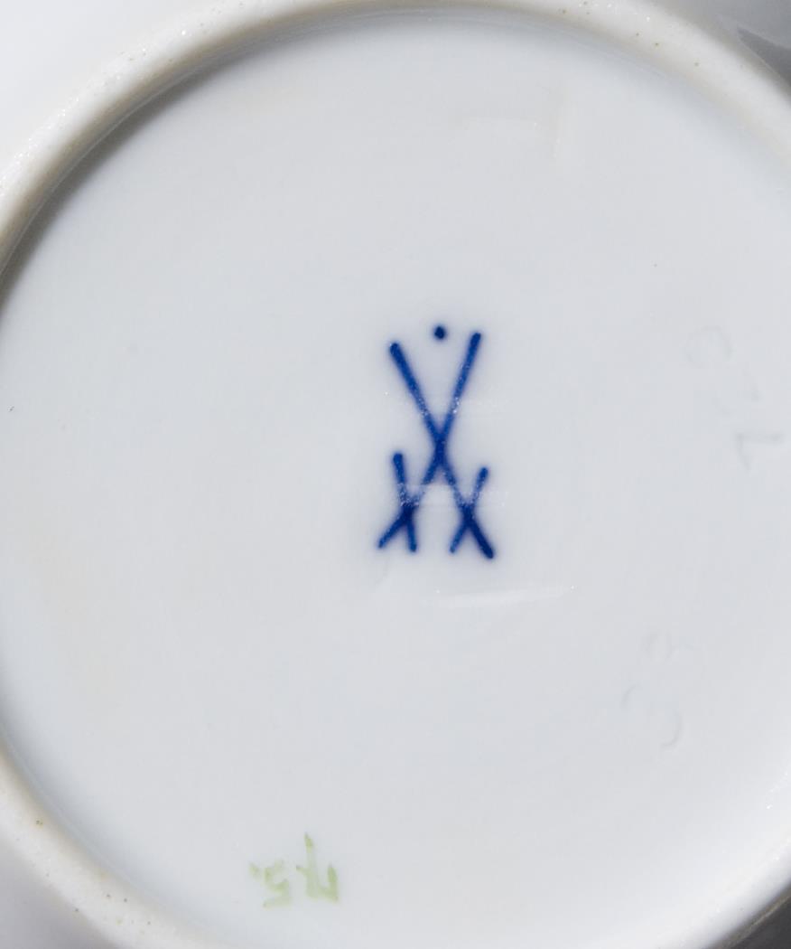 Biedermeier-Form "Schwanenhenkel". 22 Teile: 1 Kaffeekanne, 1 Kannen-Untersetzer, 1 Milchkännchen, 1 Zuckerdose, 12er Satz Tassen, 12er Satz Untertassen, 12er Satz kleine Dessertteller. Farbige Blumenbemalung. Pressmarken, Malermarken, Schwertermarken meist zweimal oder dreimal gestrichen. Milchkännchen-Fuß und ein Untersetzer-Fuß von unten minimal bestoßen.