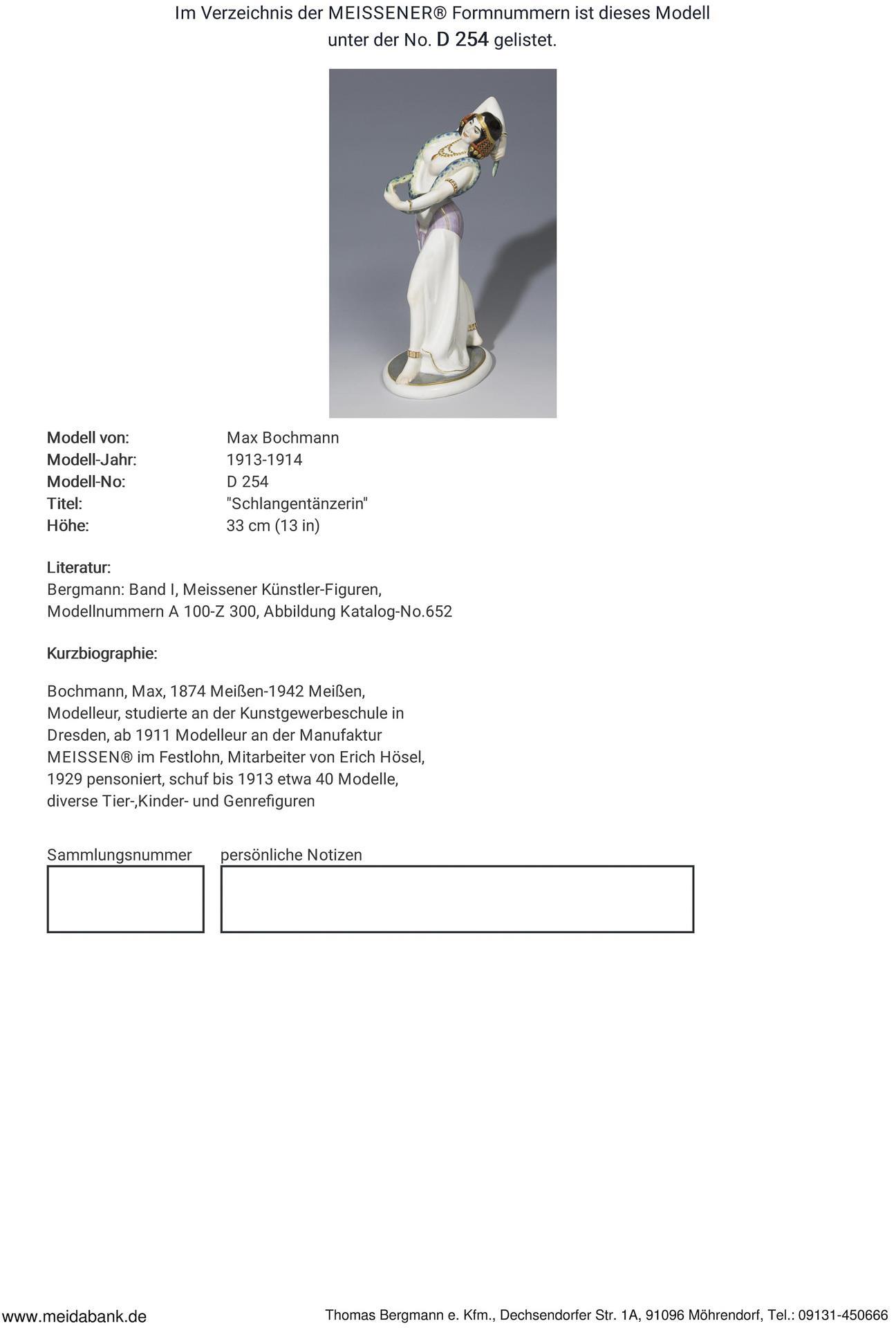 * Bochmann, Modelleur, studierte an der Kunstgewerbeschule in Dresden. Seit 1890 an der Manufaktur Meissen. Von ihm stammen seit 1905 zahlreiche Figuren, 1929 pensioniert. Alle Lose mit einem Limit (Startpreis) von mind. 1.500€ werden mit der Art Loss Register Datenbank abgeglichen.