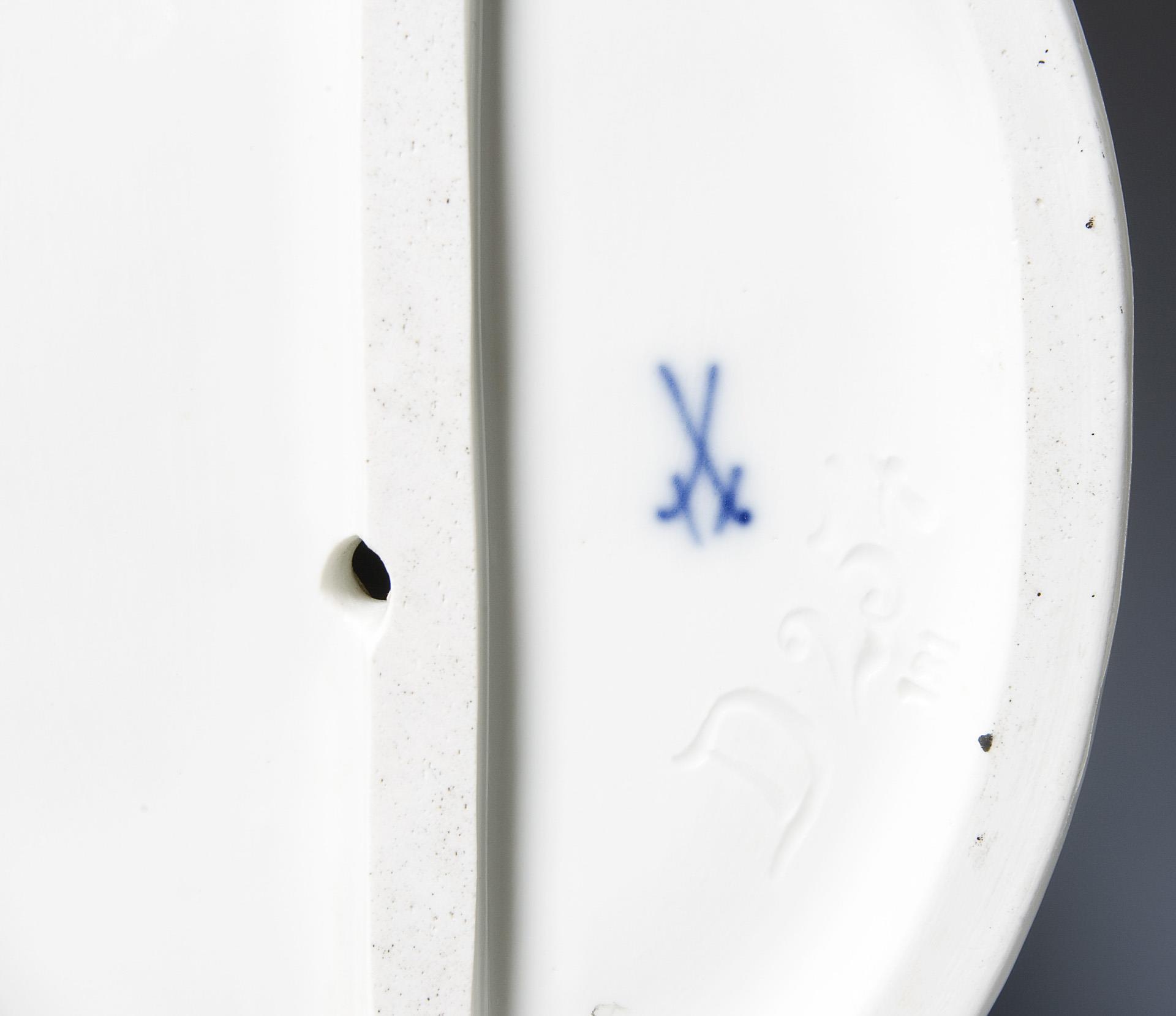 Farbig bemalt, gold staffiert. Ritzmarke, Pressmarke, Malermarke, Schwertermarke. Zunge der Schlange, rückseitig Ende der Schlange bestoßen, minimaler Brandriss auf der Hand.