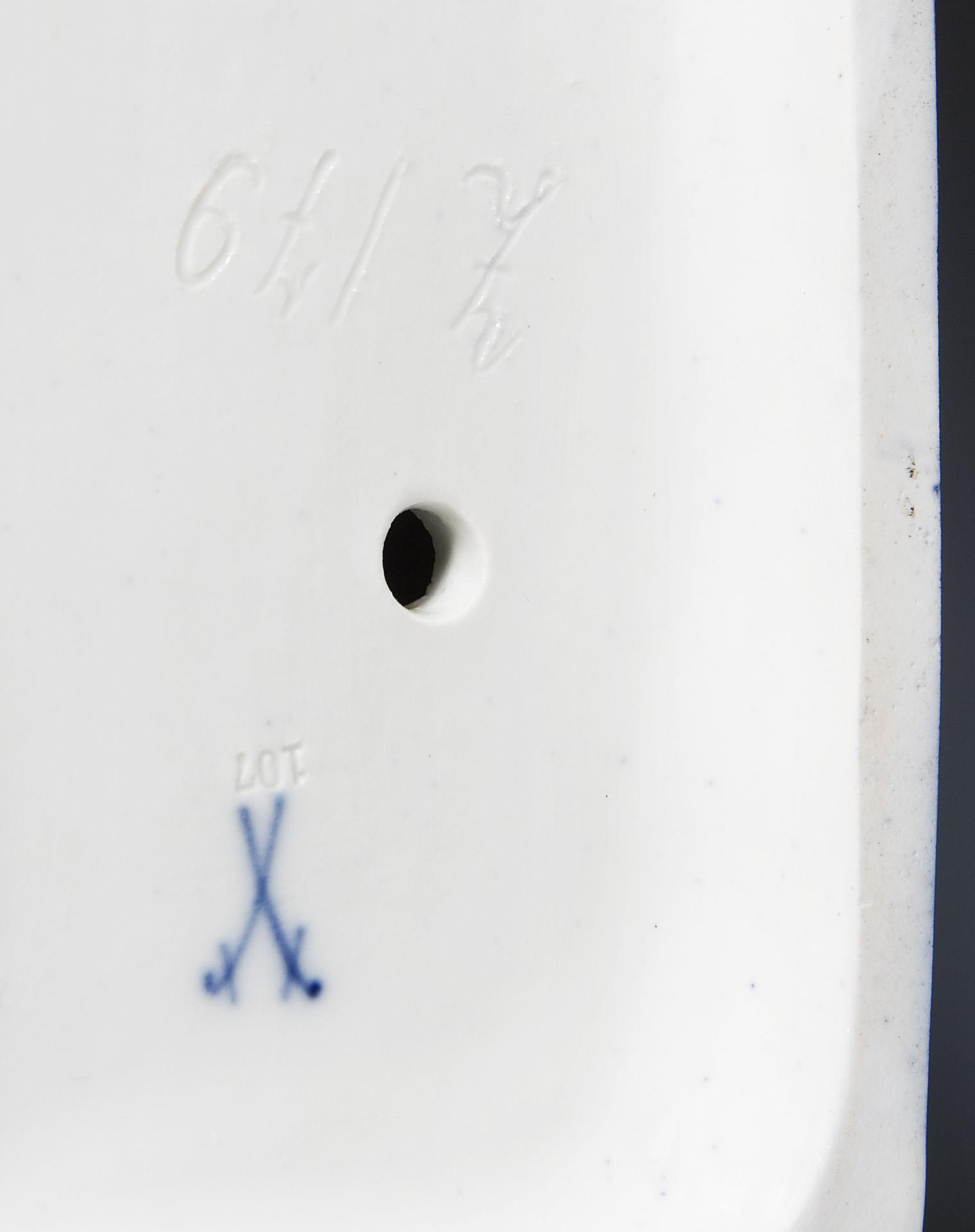 Aus einer Serie von 4 Gruppen, farbig und gold bemalt, Sockel mit kobaltblauem Fond. Ritzmarke, Pressmarke, Malermarke, Schwertermarke.