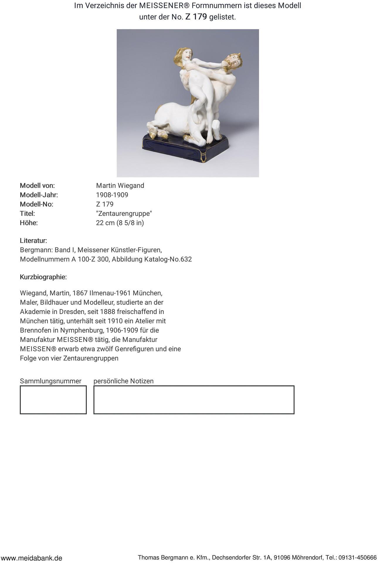 Ausformung 1908-1923. Modell-Jahr: 1908-1909, Modell-Nr. Z 179. Modell von. WIEGAND, Martin(1867 Ilmenau - 1961 München)