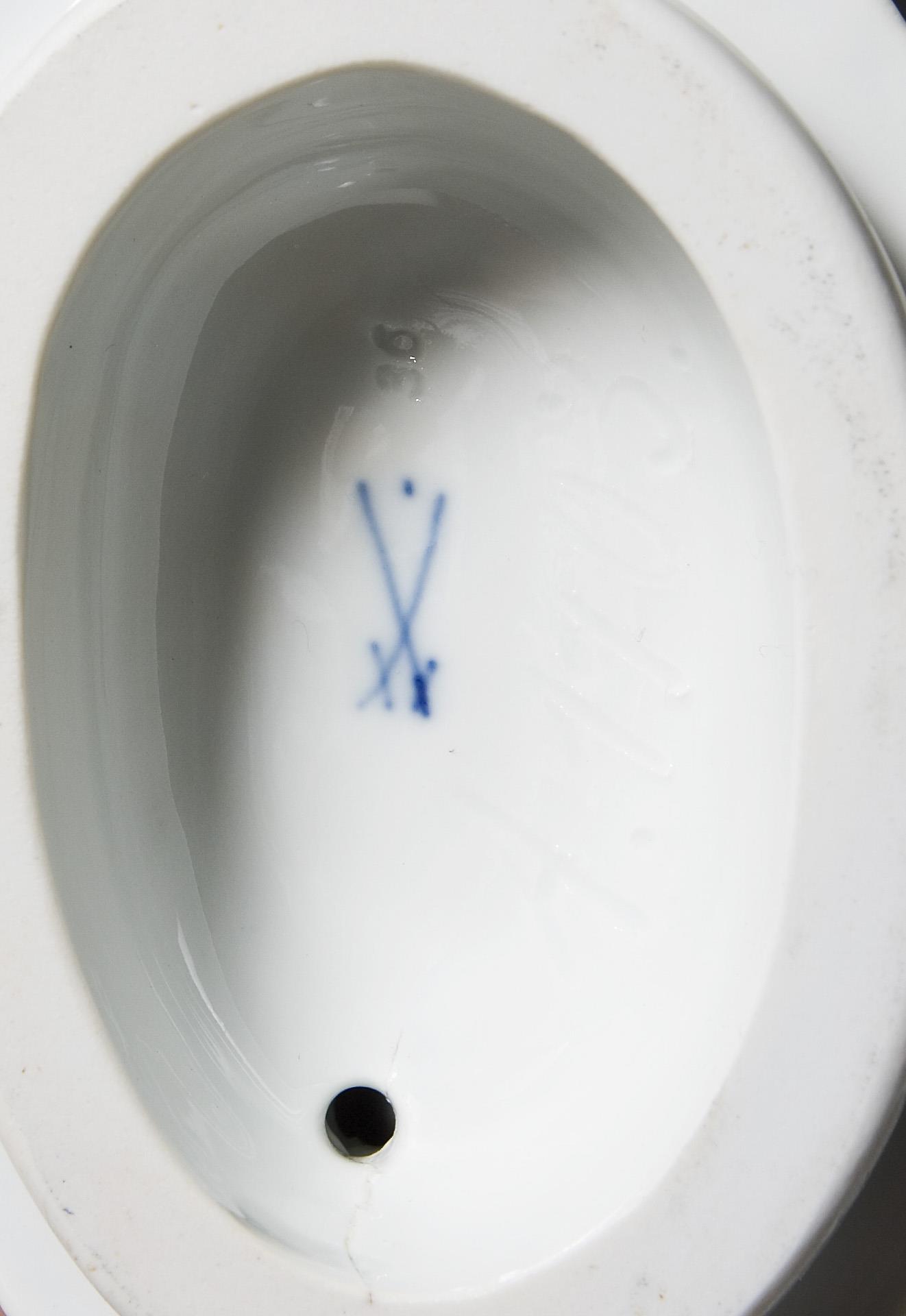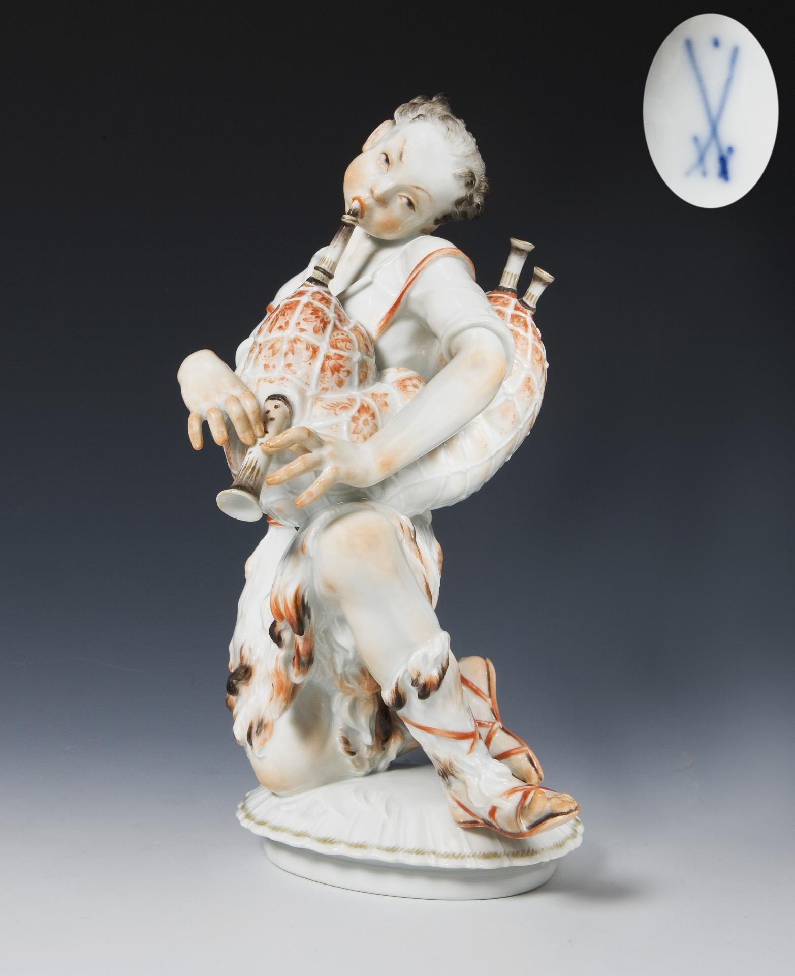 Aus einer Serie von 8 Figuren, farbig bemalt. Ritzmarke, Pressmarke, Malermarke, Schwertermarke mit Punkt, Künstler-Signet. Pfeifenränder restauriert.