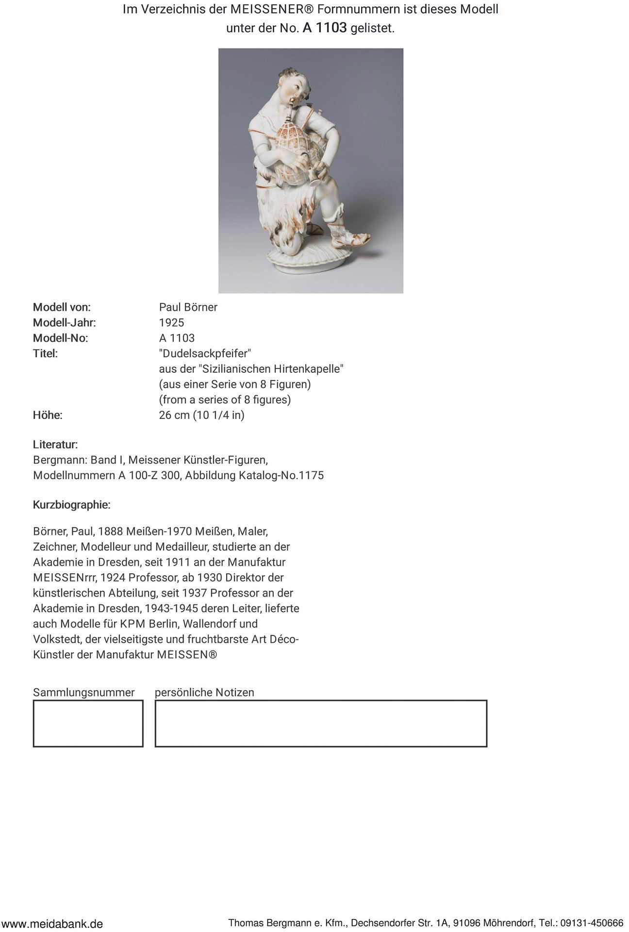 * Börner, Maler, Zeichner, Modelleur und Medailleur, studierte an der Akademie in Dresden. Seit 1911 an der Manufaktur Meissen, 1924 Professor, ab 1930 Direktor der künstlerischen Abteilung, seit 1937 Professor an der Akademie in Dresden, 1943-1945 deren Leiter. Lieferte auch Modelle für KPM Berlin, Wallendorf und Volkstedt, der vielseitigste und fruchtbarste Art déco-Künstler der Manufaktur Meissen.